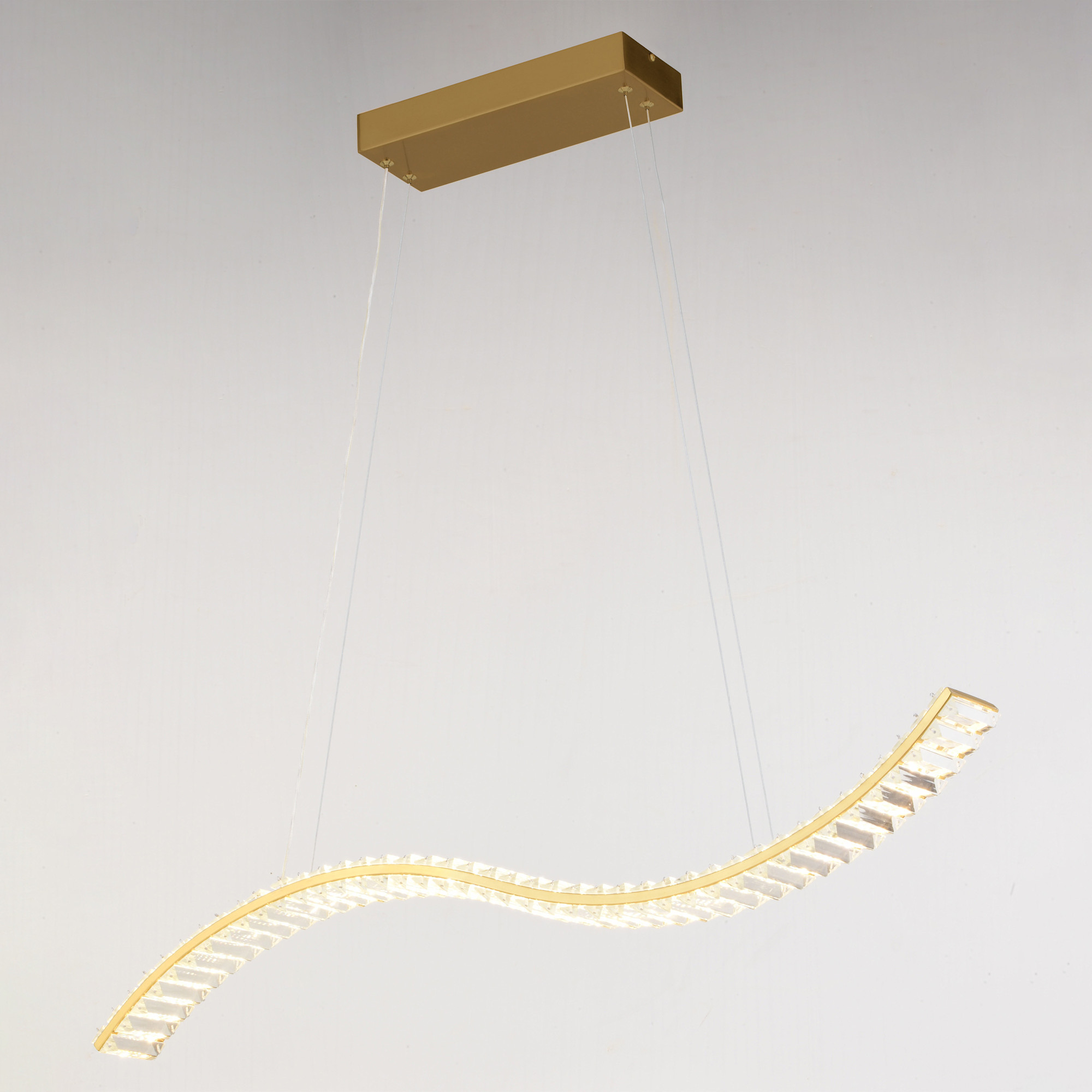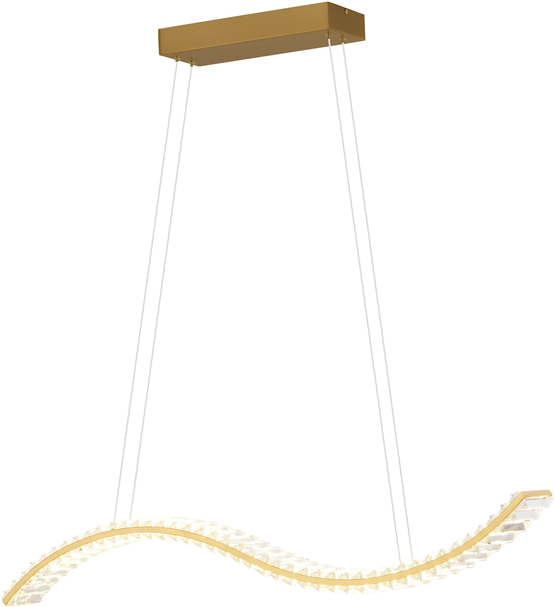 Item DescriptionMake a dazzling statement with the Edgewater LED pendant, perfect for adding sparkle and glamour to your contemporary or transitional spaces. Shimmering square glass crystals along a brass frame create a captivating wave of light, illuminating your kitchen island, dining table, or workspace with brilliance and luxury.