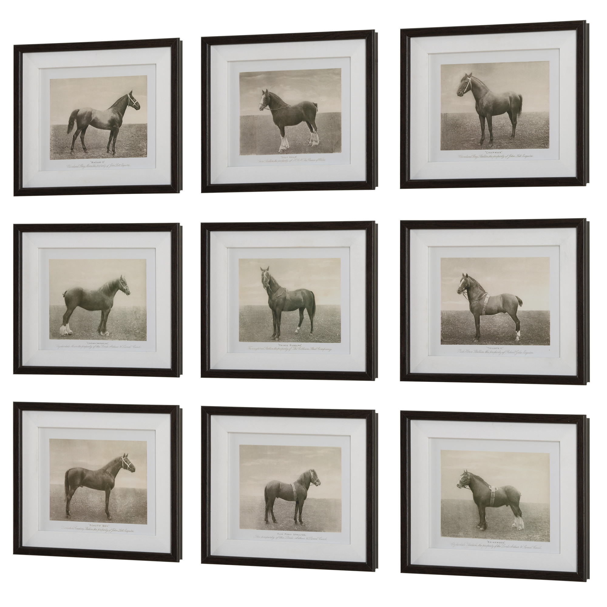Item DescriptionThis regal set showcases nine antiqued sketches of horses belonging to dignitaries and elite members of society. Surrounded by a beveled wood grain frame and a crisp linen liner. Each print is placed under protective glass.