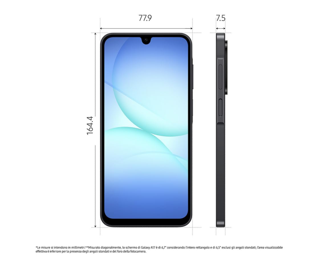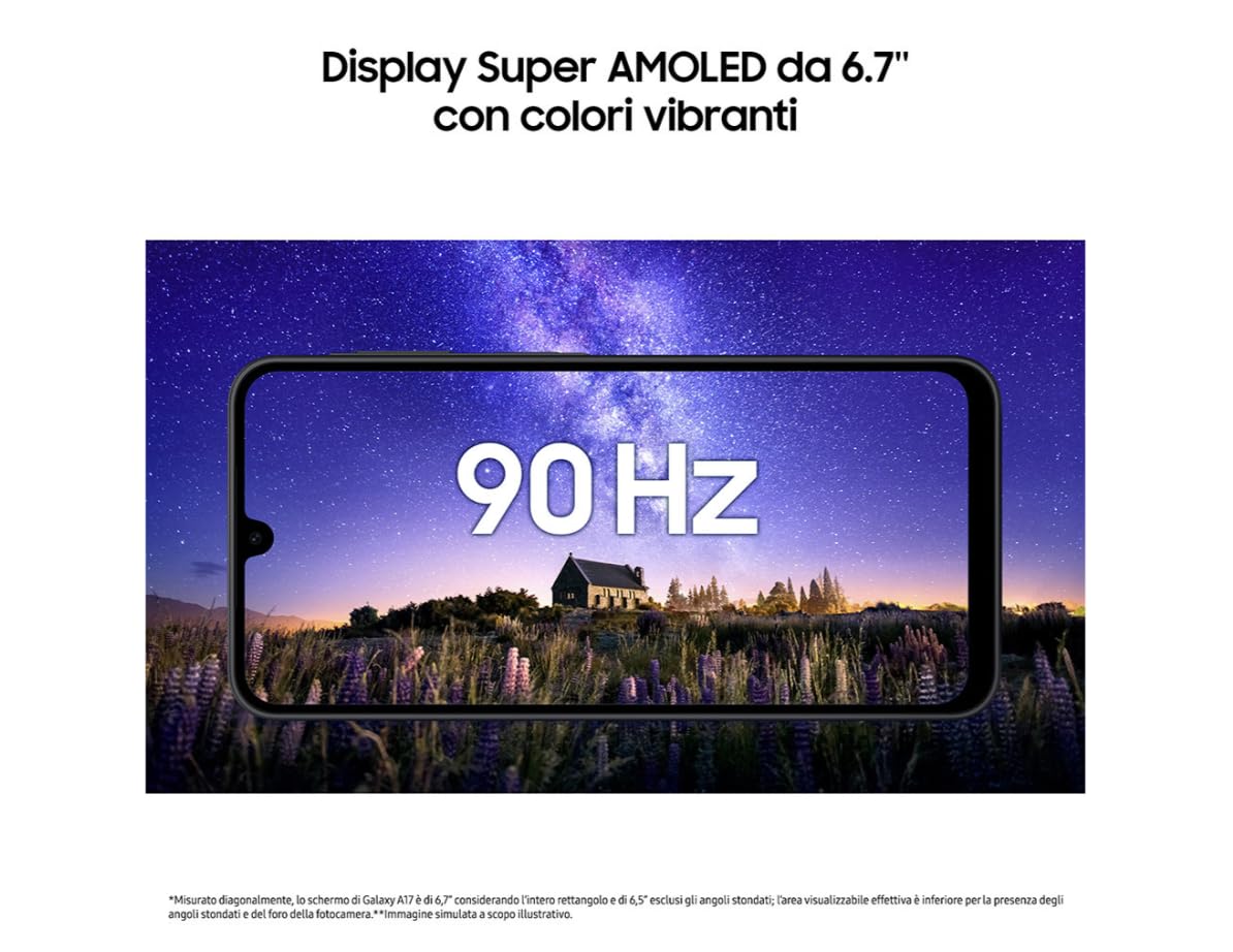 Informazioni su Samsung Galaxy A17 4G 128GB/4GB Dual SIM NeroDisplay Super AMOLED Full HD+ da 6,7"Goditi un'esperienza visiva coinvolgente con colori vibranti, neri profondi e un refresh rate adattivo fino a 90 Hz per giochi, editing e streaming senza sfocature. Anche sotto la luce solare diretta, la visibilità rimane eccellente.Prestazioni ed efficienza sostenuteIl processore octa-core (Exynos/MediaTek G99, a seconda della versione) ottimizza tutte le attività, dalle multitasking intensive ai giochi o alla riproduzione di contenuti 4K, riducendo al minimo il consumo energetico. Con 4 GB di RAM e 128 GB di archiviazione interna, espandibili fino a 2 TB tramite microSD, puoi eseguire diverse applicazioni contemporaneamente e archiviare enormi librerie di dati senza rallentamenti o cali delle prestazioni.Avanzata fotocamera da 50 MP con stabilizzazione ottica dell'immagine (OIS)Cattura immagini nitide anche in condizioni di scarsa illuminazione con la stabilizzazione ottica e la modalità Ultra Wide per paesaggi o foto di gruppo. La lente Macro ti mostra dettagli incredibili, mentre la fotocamera frontale da 13 MP migliora ogni selfie con realismo superiore.Batteria da 5000 mAh e ricarica rapida da 25 WHai abbastanza energia per un'intera giornata, che tu sia in viaggio, in videoconferenza o a modificare in movimento. Dimentica il caricabatterie per ore e ricarica rapidamente senza intoppi nella tua routine.Sicurezza professionaleIl sistema Samsung Knox Vault protegge i tuoi dati più sensibili, mentre il riconoscimento facciale e il lettore di impronte digitali sullo schermo impediscono accessi non autorizzati. Riceverai patch e aggiornamenti di sicurezza per anni, ideali sia per un uso professionale che per utenti più esigenti.Connettività versatile e resistenza IP54Compatibile con 4G, Wi-Fi 5, Bluetooth 5.3, NFC, Dual SIM ibrido e USB-C 2.0. Dispone anche di certificazione IP54 contro polvere e schizzi. Il telaio leggero (190 g) e la struttura rinforzata offrono una