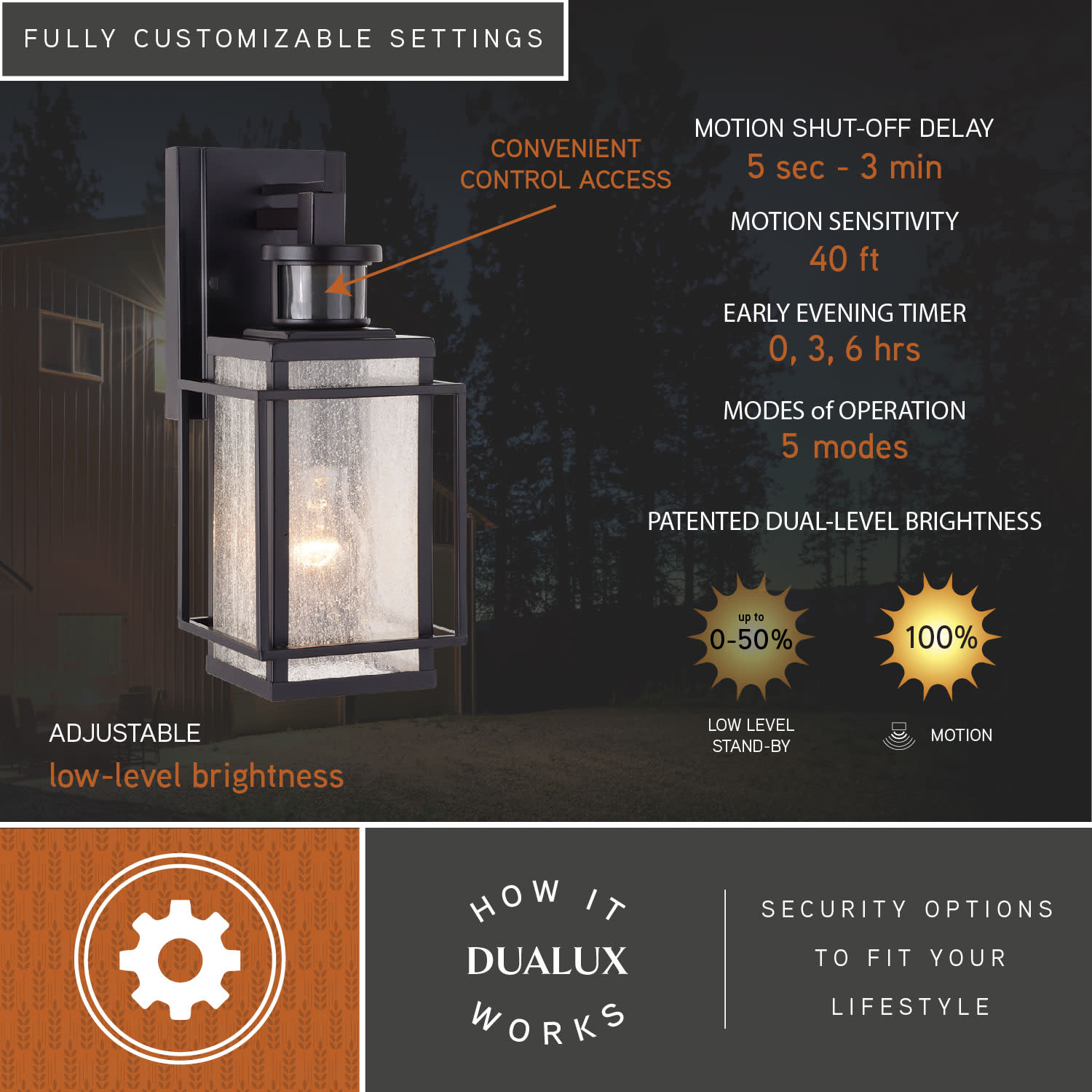 Item DescriptionThe layered rectangular geometry of the Hyde Park evokes the spirit of mission styling perfect for prairie inspired decors. This outdoor wall light is ideal for your covered porch, entryway, garage, or any other area of your home. Dualux patented dual-level security lighting is outdoor lighting made smarter - brighter light at dusk, dimmer at night, brightening instantly when it detects motion.