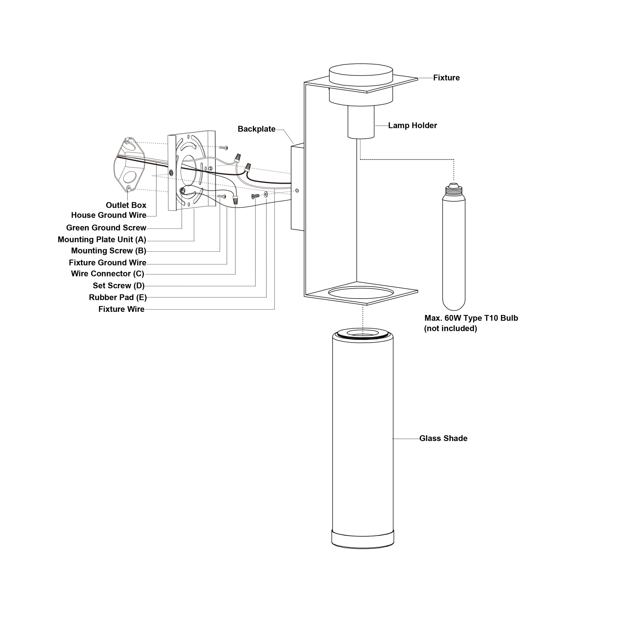 - (1) medium (E26) base T10 shape 60 watt bulb required (not included)