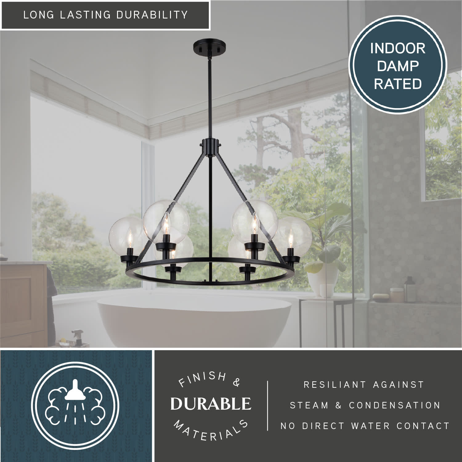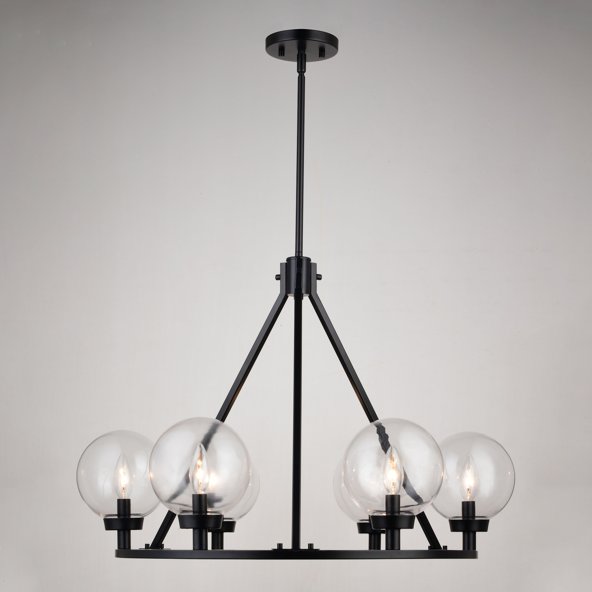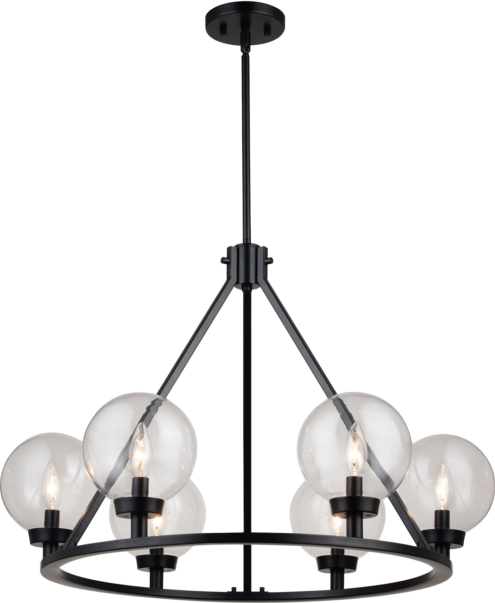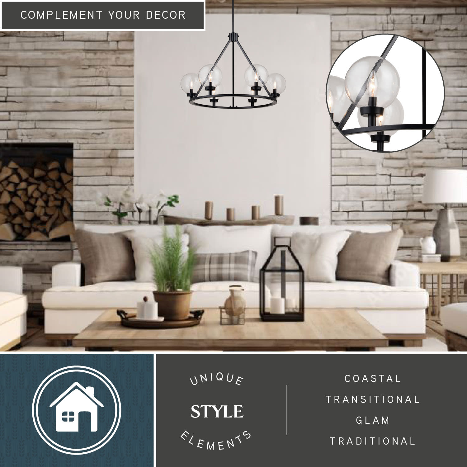 Item DescriptionThe Lander interior lighting collection is contemporary style with flair. A distinctive metal ring supports and highlights the clear glass globe shades. Hung with down rods suitable for vaulted ceilings, this chandelier light fixture is a perfect addition to your dining area or any other living area where a little extra style is desired.