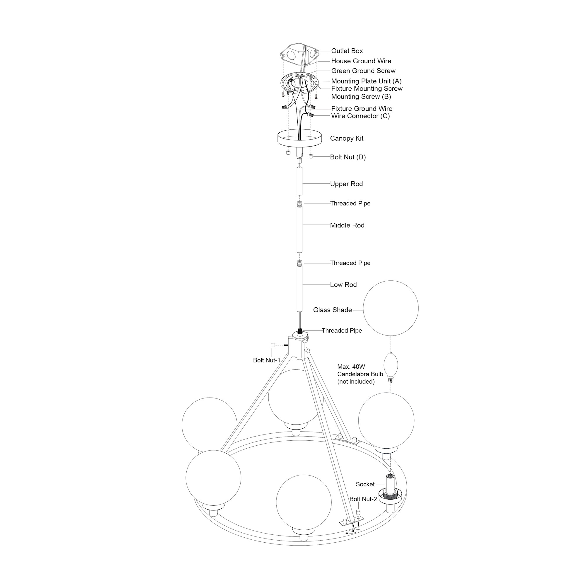 - (6) candelabra (E12) base B10 shaped 40 watt bulbs required (not included)