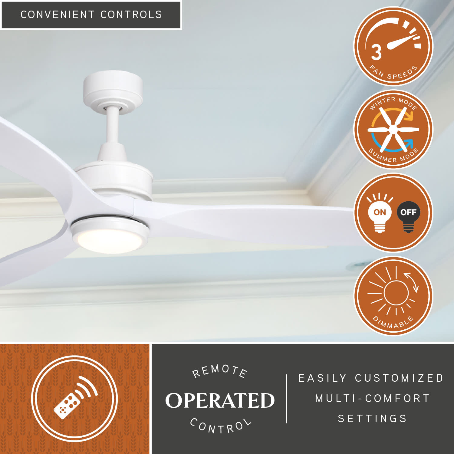 Item DescriptionThe bright finish, hand carved solid wood blades, and clean lines give the Curtiss ceiling fan its on-trend contemporary look. This fan is compatible with sloped ceilings and includes a 6 inch downrod (longer down rods sold separately). Exterior damp rated, ideal for indoor or outdoor spaces such as entryway, family room, bedroom, bathroom, living room, kitchen, or covered outdoor porches. Remote control included for added convenience. An integrated LED light kit provides energy savings, low maintenance and long-lasting performance.