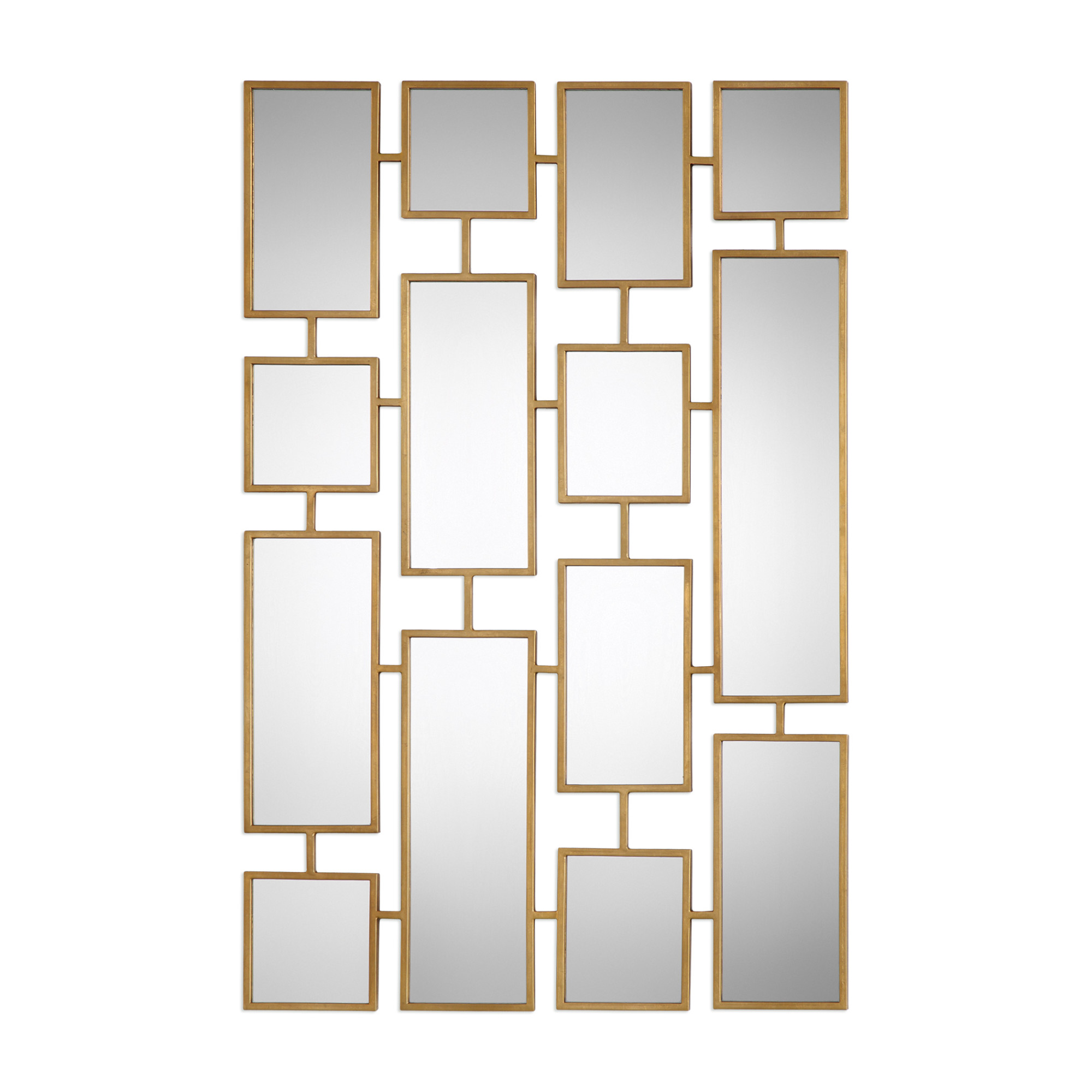 Item DescriptionCraftily connected forged iron rectangles finished in a lightly antiqued gold leaf. May be hung horizontal or vertical.