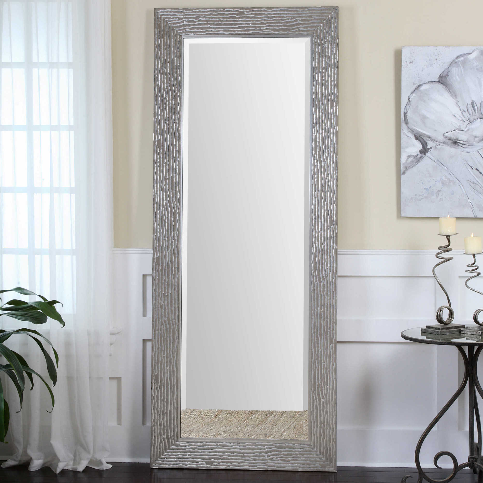 Item DescriptionFrame has a metallic silver finish with a heavy, taupe gray wash. Mirror has a generous 1 1/4" bevel. May be hung horizontal or vertical.