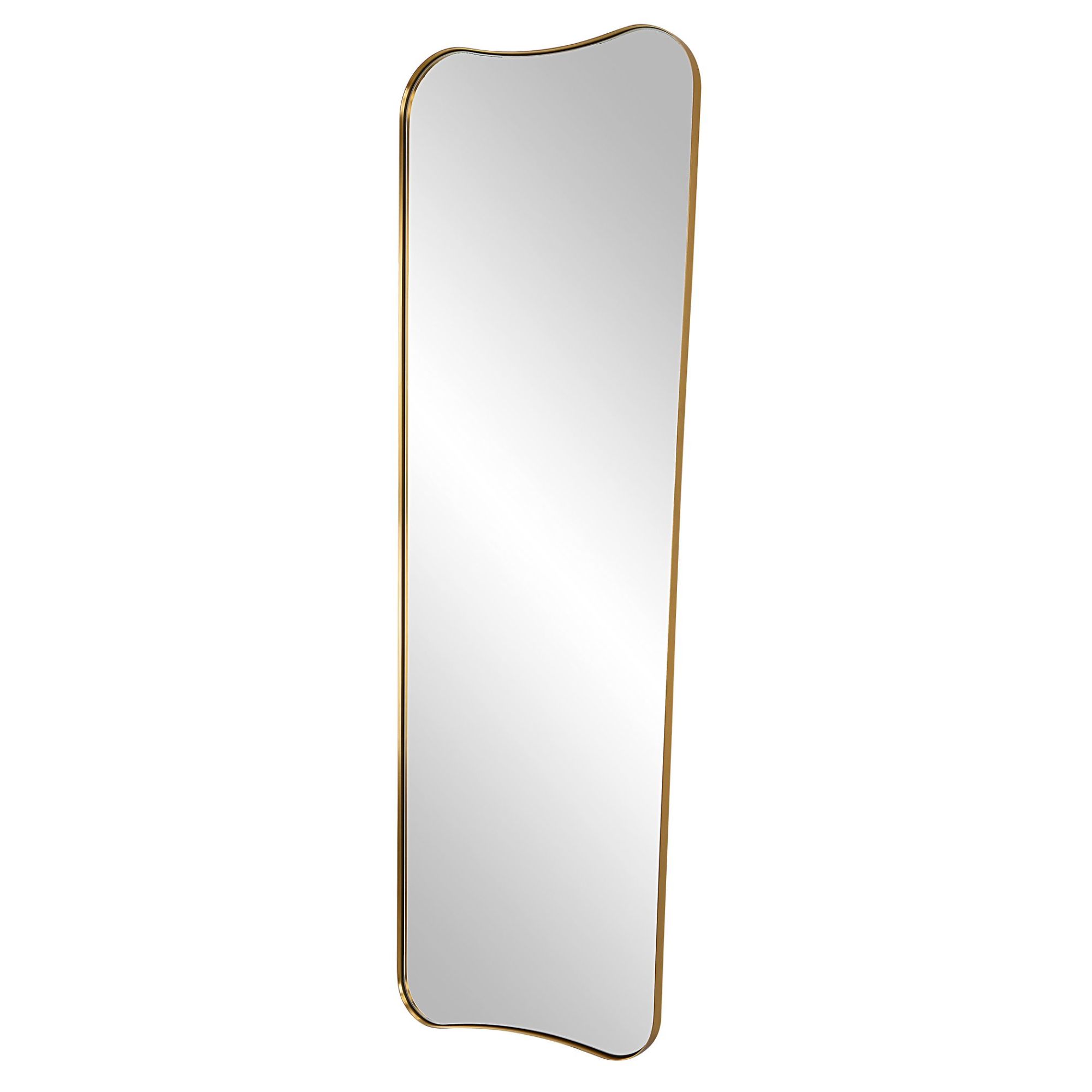 - This oversized mirror features a sophisticated stainless steel frame finished in a rich antique brass