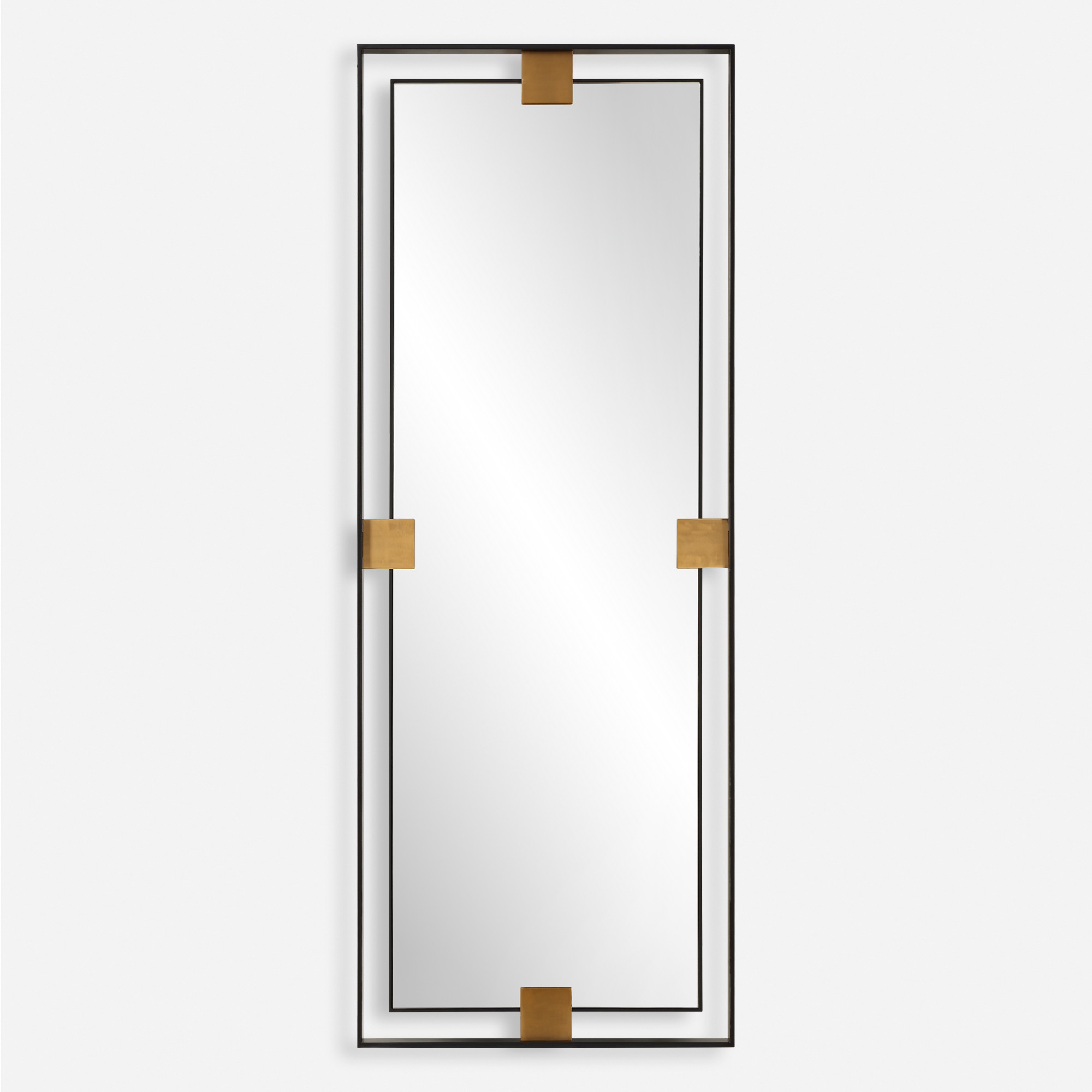 Item DescriptionThe cornerstone mirror, oversized in stature, features plated brushed brass details surrounded by a metal, free-floating border. May be hung horizontal or vertical.
