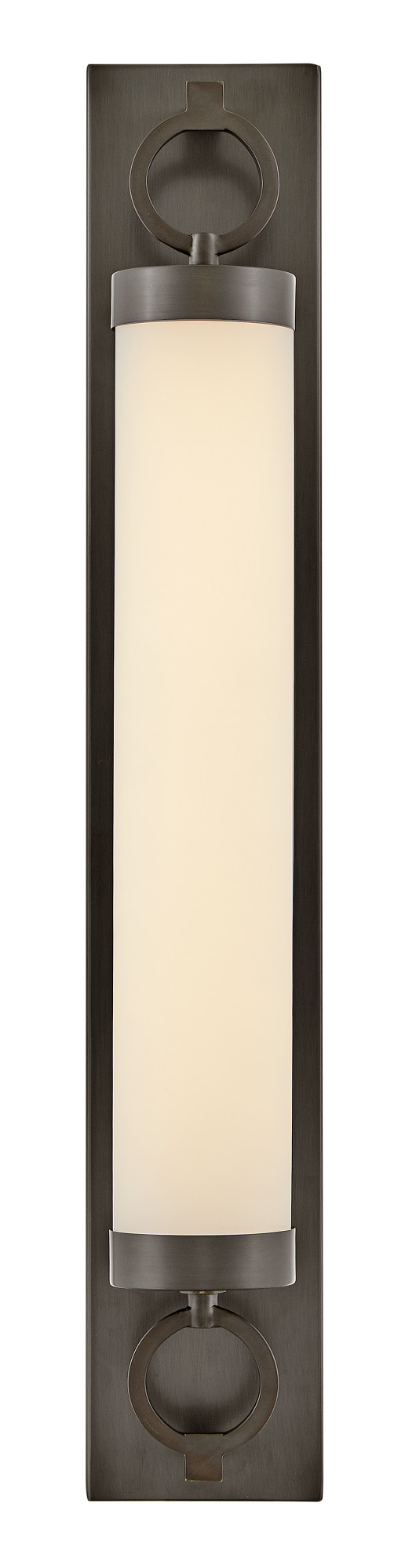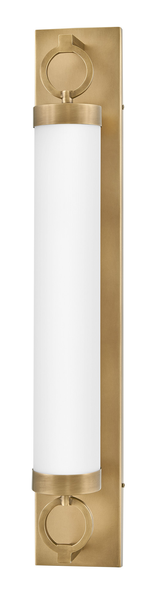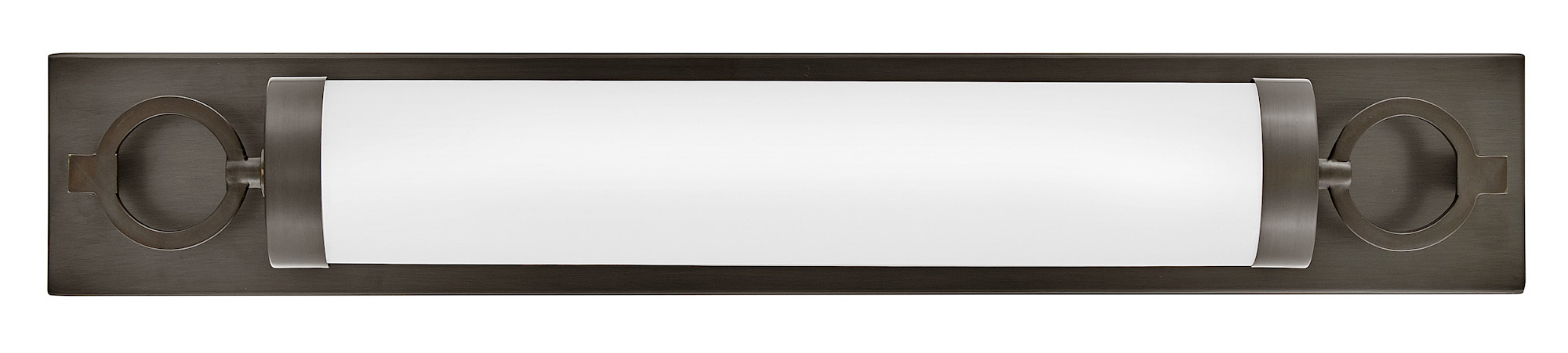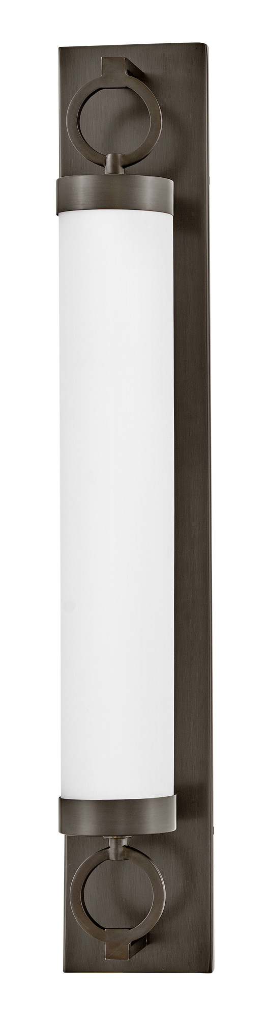For a fixture that is an industrial piece of art, look to Baylor. The sturdy back plate and decorative rings add a nice balance to the etched opal glass to finish off the strong, substantial look. Ideal for providing plenty of functional light, Baylor mounts cleanly to the wall vertically or horizontally to bring style to primary bath, powder rooms, and more. Baylor is part of the Lisa McDennon Collection.