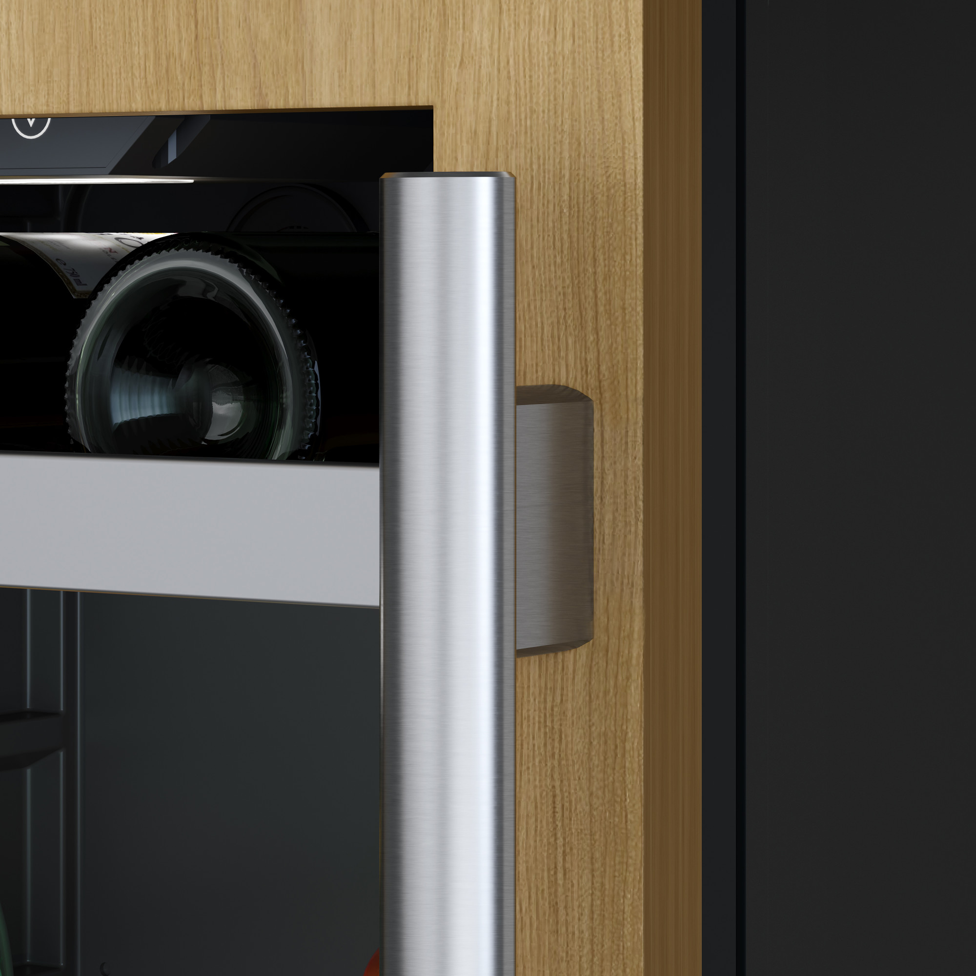 - Three roll-out glass shelves with stainless steel trim
