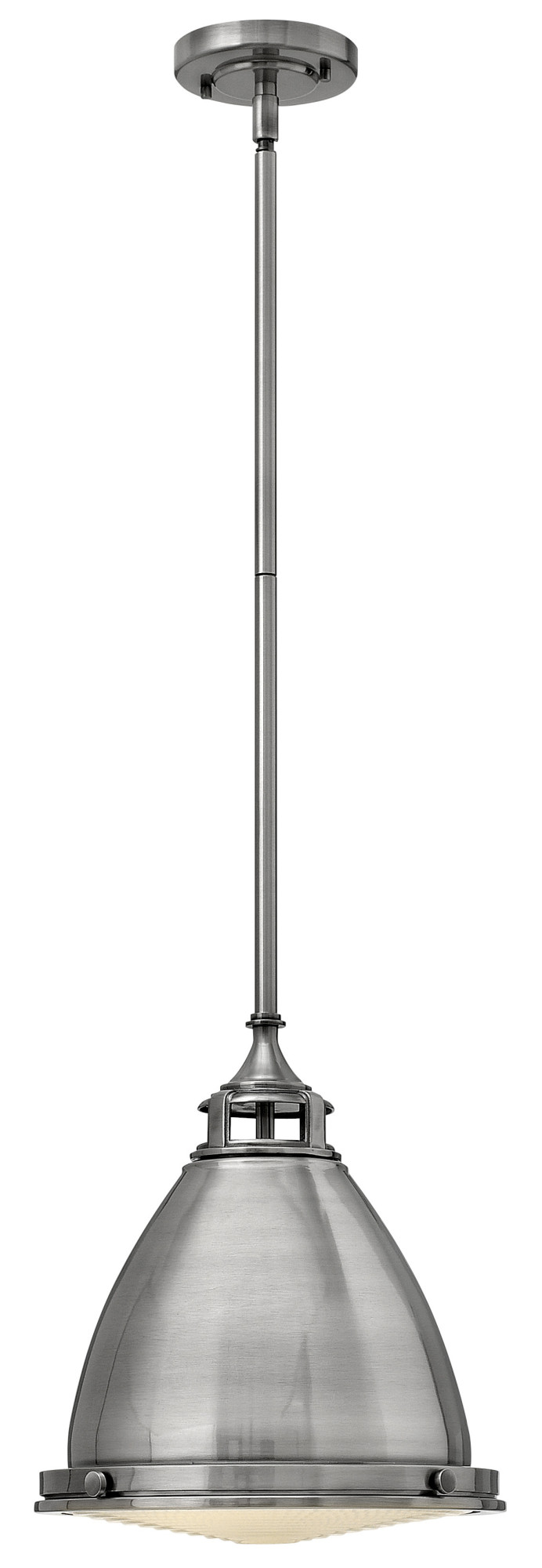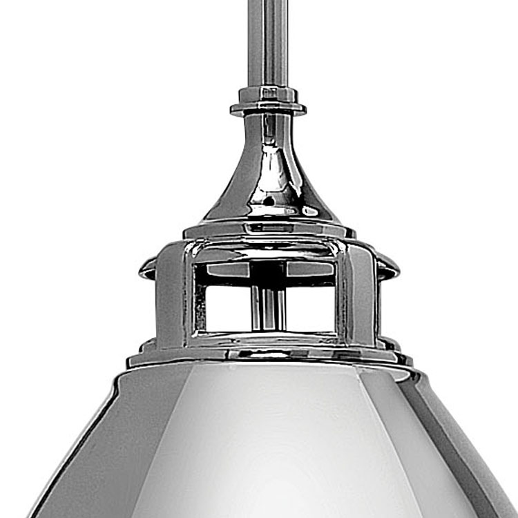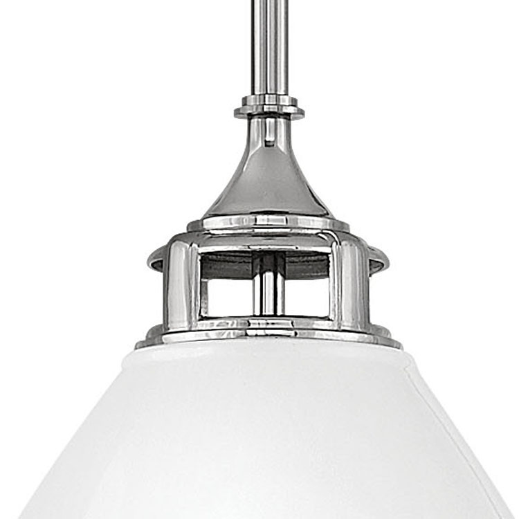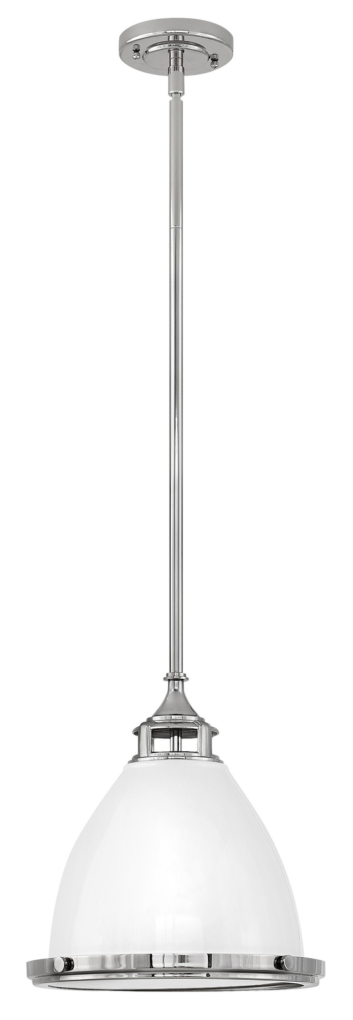 Item DescriptionAmelia's classic pendant design reinvents vintage details witha cast glass fitter, cast metal trim ring and ornamental clasps. The Polished White finish will infuse any space with a dash of fresh American style.