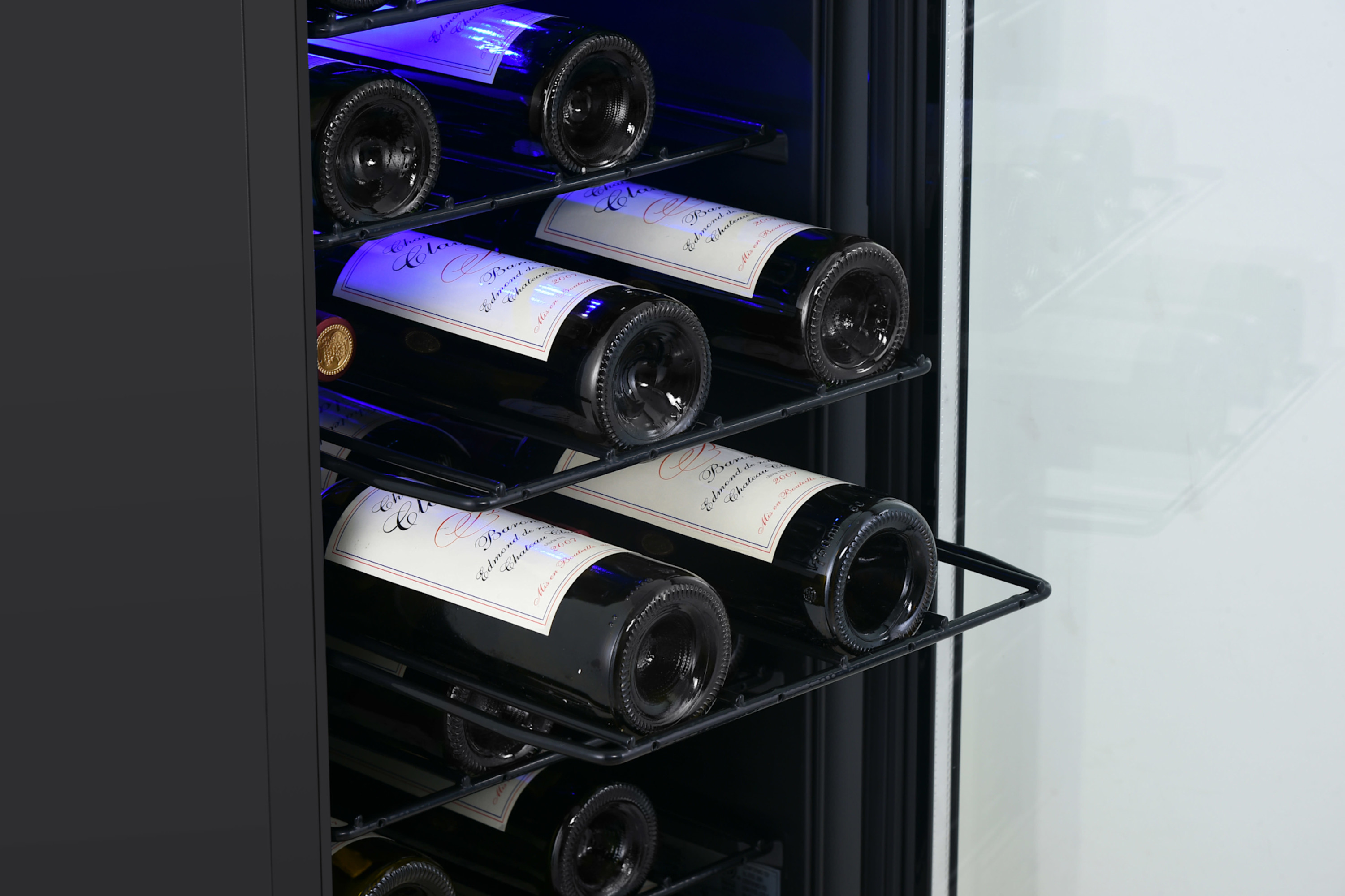 - The slide-out shelving can accommodate up to 25 standard size Bordeaux wine bottles