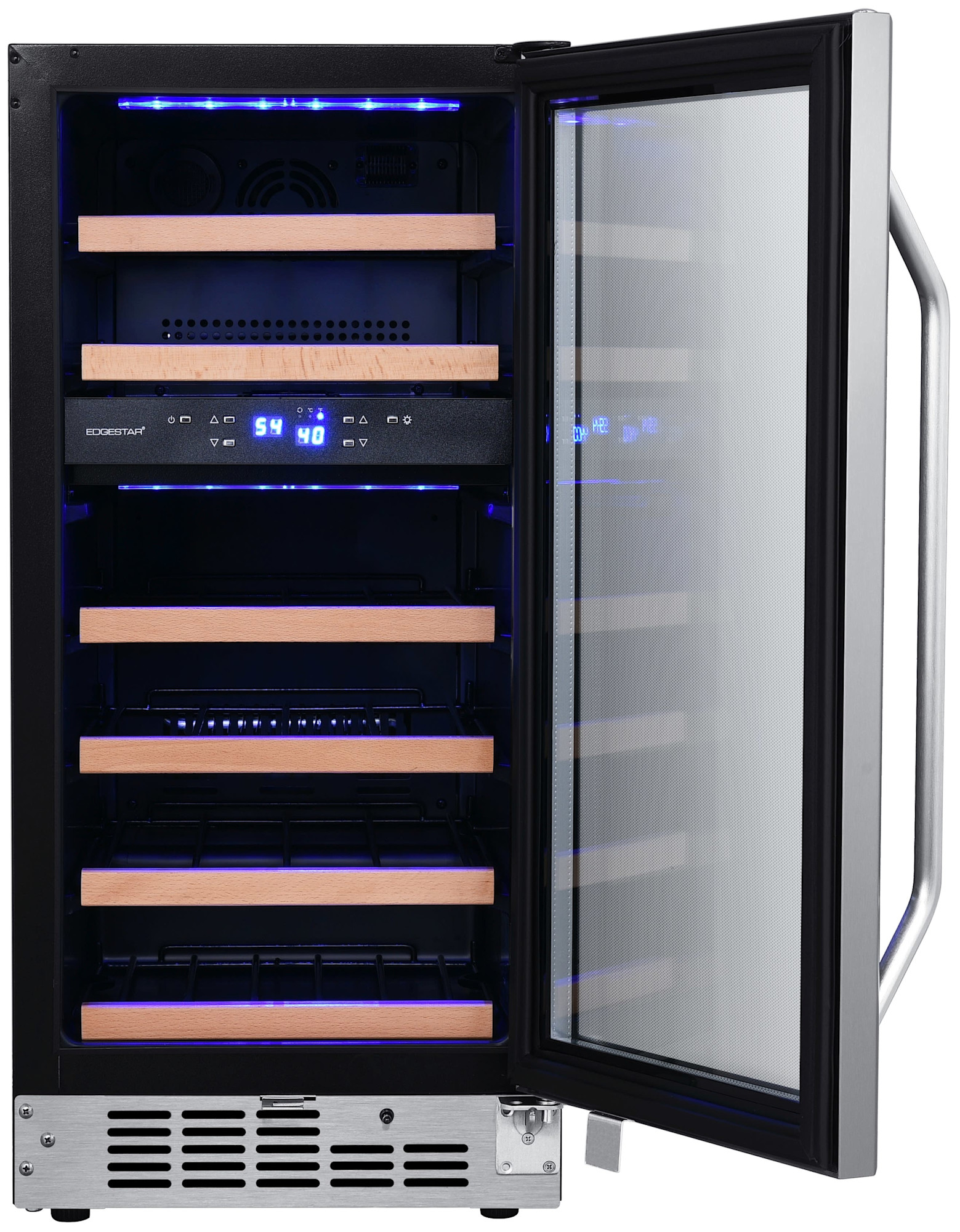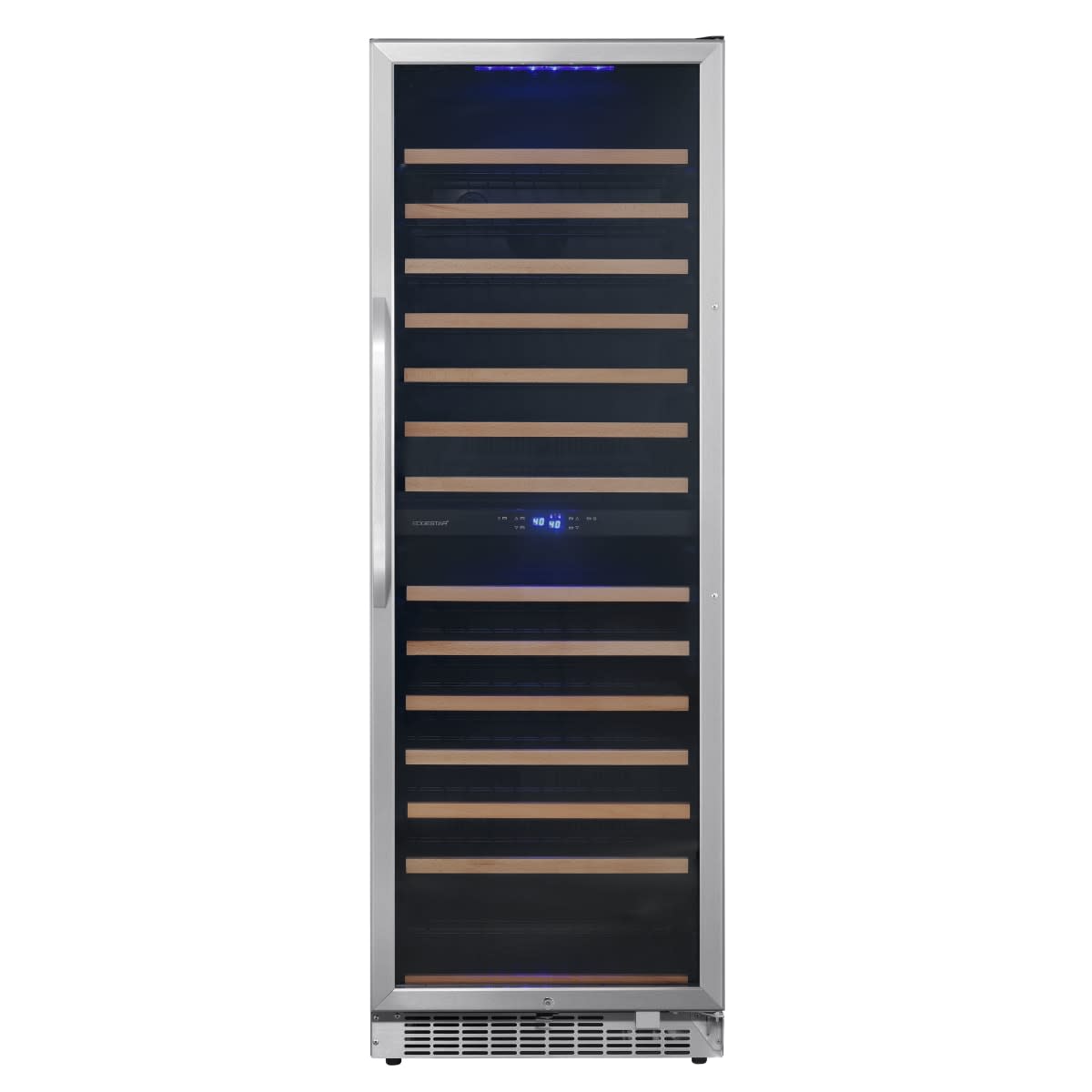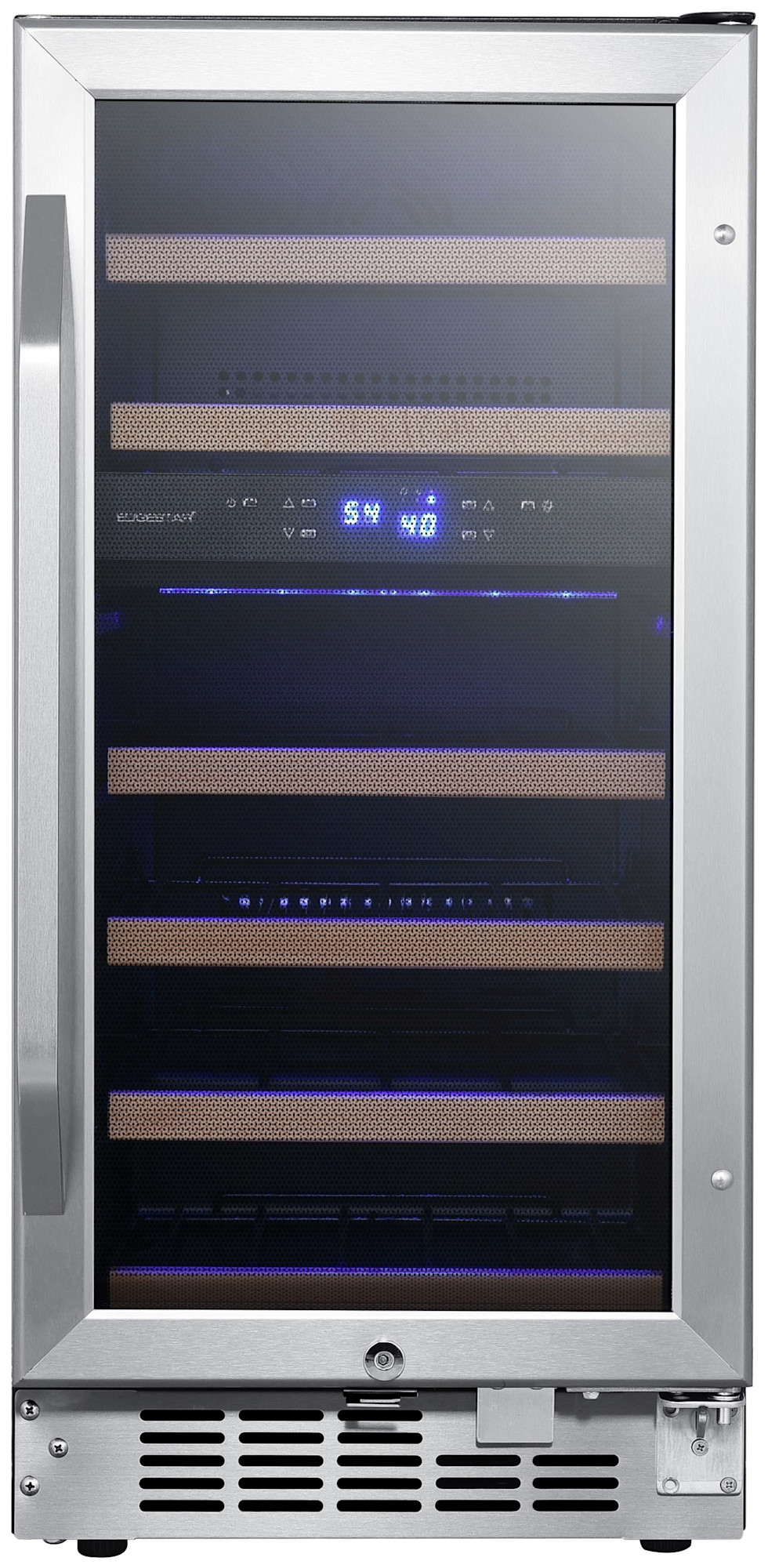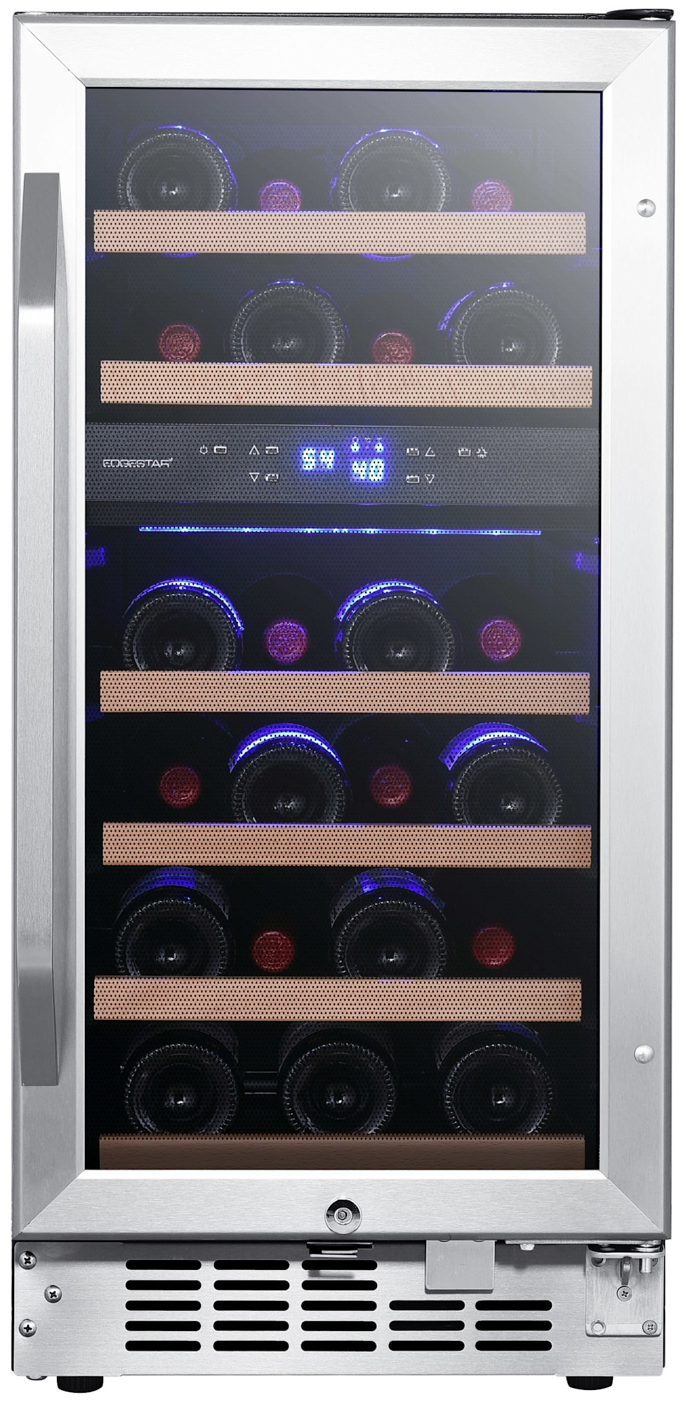 - A dual pained glass door stainless steel-trimmed with stainless steel venting grate make this wine cooler look great in any living situation