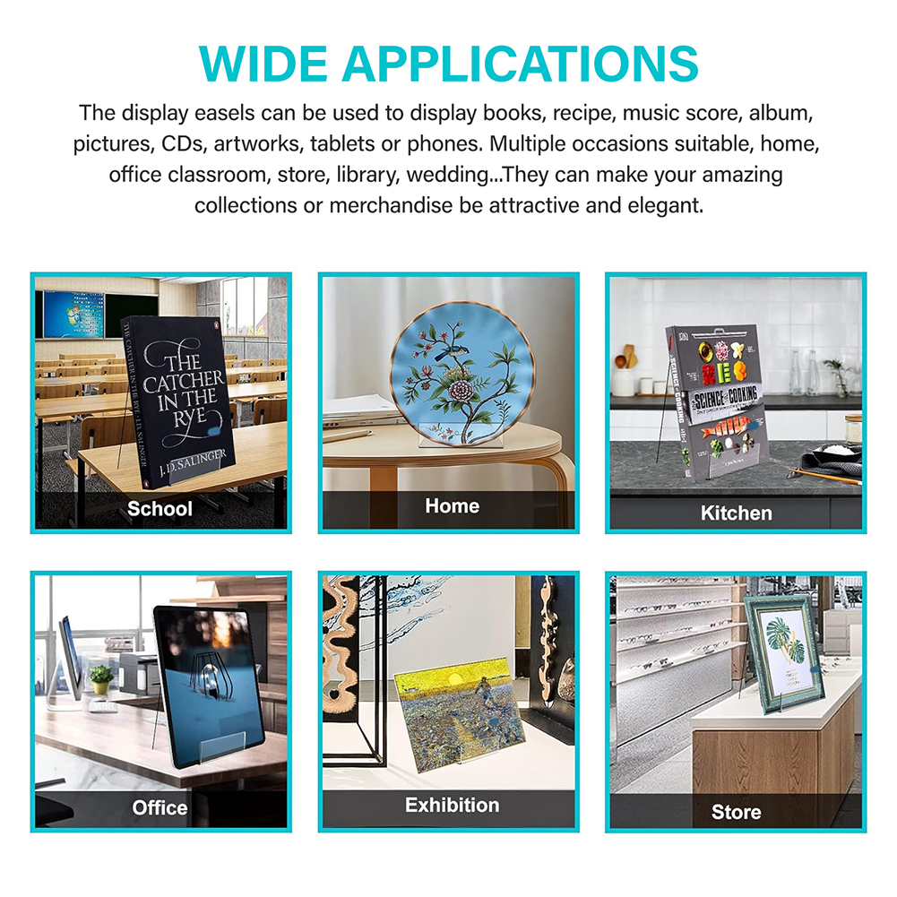 WIDE APPLICATIONS: The display easels can be used to display books, recipe, music score, album, pictures, CDs, artworks, tablets or phones. Multiple occasions suitable, home, office classroom, store, library, wedding...They can make your amazing collections or merchandise be attractive and elegant.