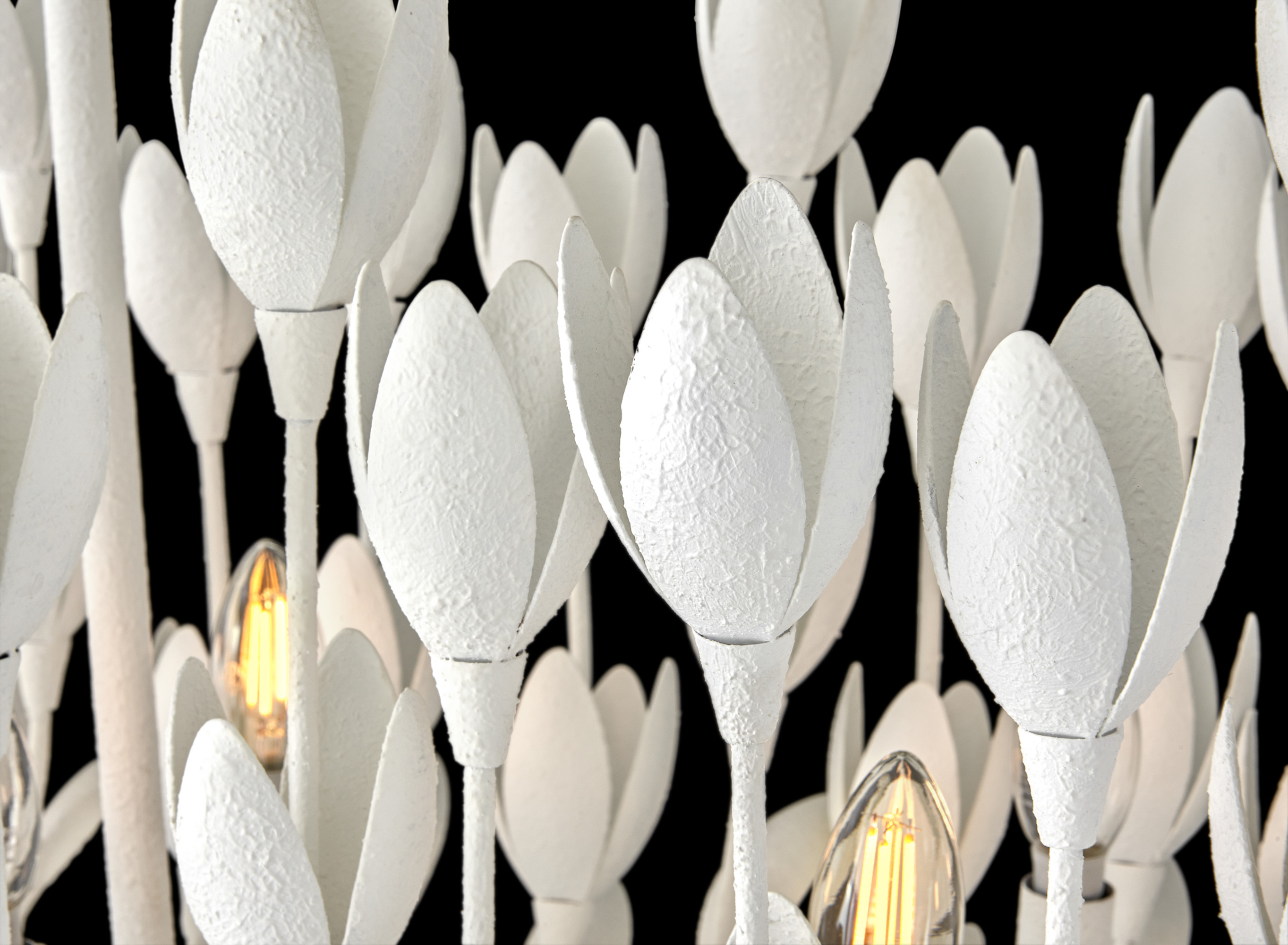 Flora is a work of art inspired by the delicate nature and beauty of florals. Blurring the line between lighting and sculpture, Flora's handmade, hand-painted blooms mesmerizingly unfold while the bulbs beautifully nestle inside. Flora is available in a stunning Burnished Gold or Textured Plaster finish and is part of the Lisa McDennon collection.