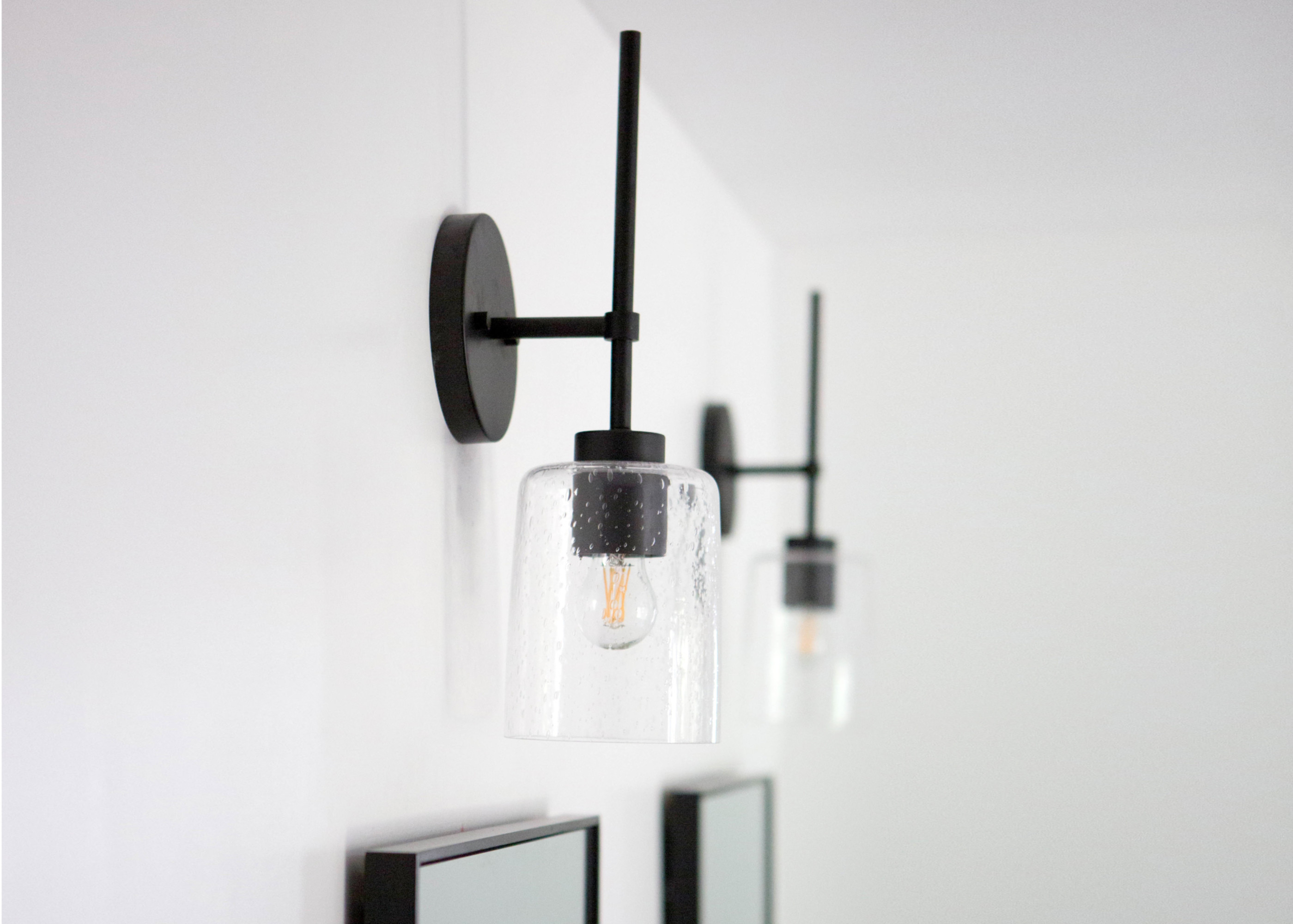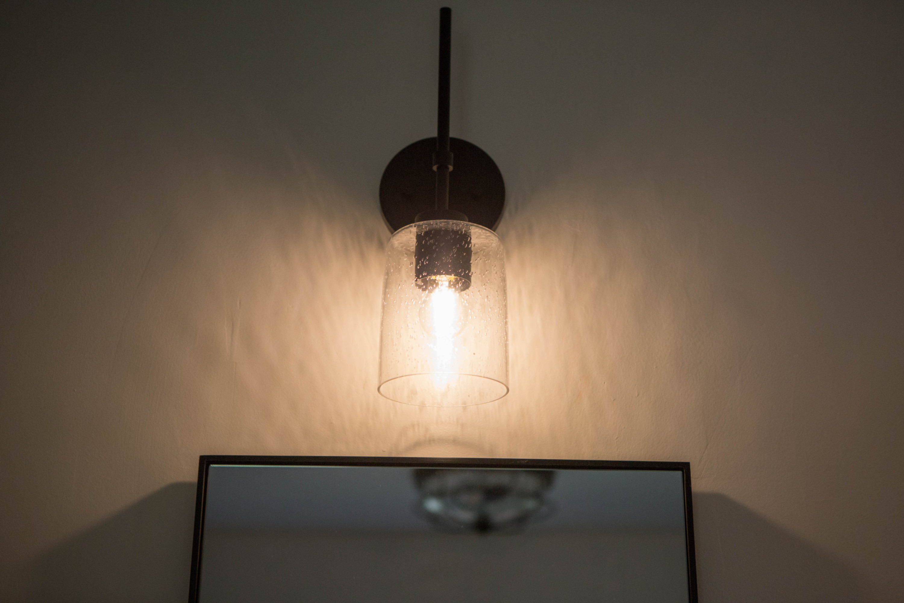 - Fixture includes a clear seedy glass shade