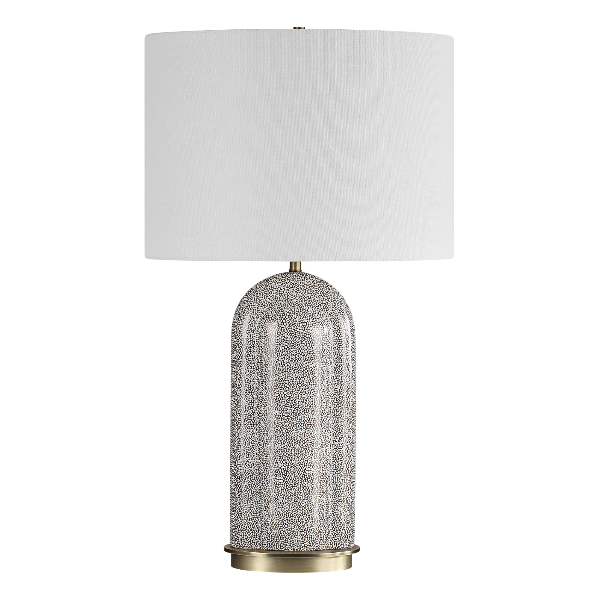 Item DescriptionThis eye-catching lamp features a porcelain base adorned with a unique dapple pattern, set against a rich background. Brushed plated accents add the perfect touch of warmth and sophistication to this piece. The oval hardback shade is finished in a linen fabric.