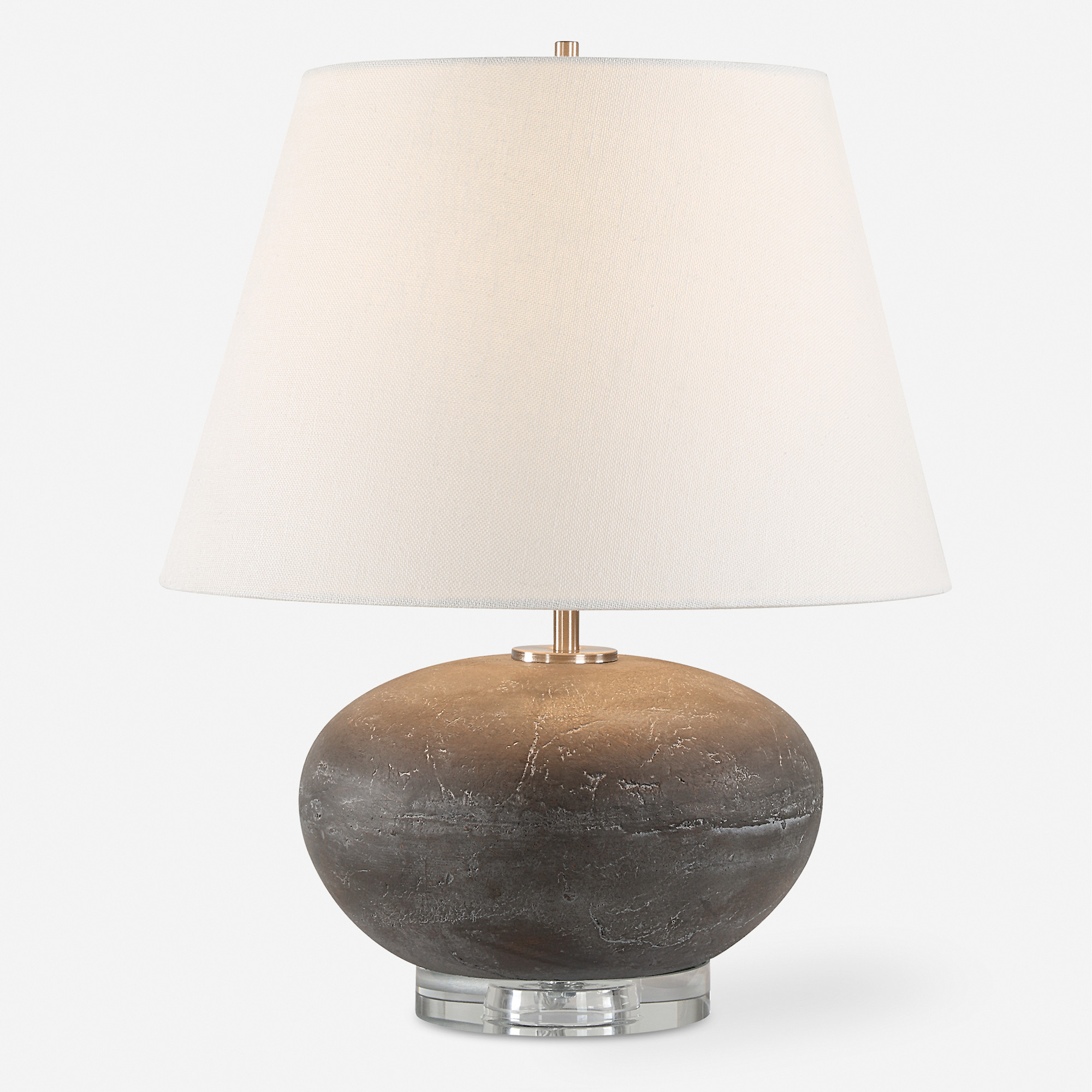 Item DescriptionFeaturing a ceramic base with unique stone-like texture and bronze highlights. The beckley table lamp is elegantly accented with a thick crystal foot and plated hardware. The tapered round hardback shade is covered in a casual linen fabric.