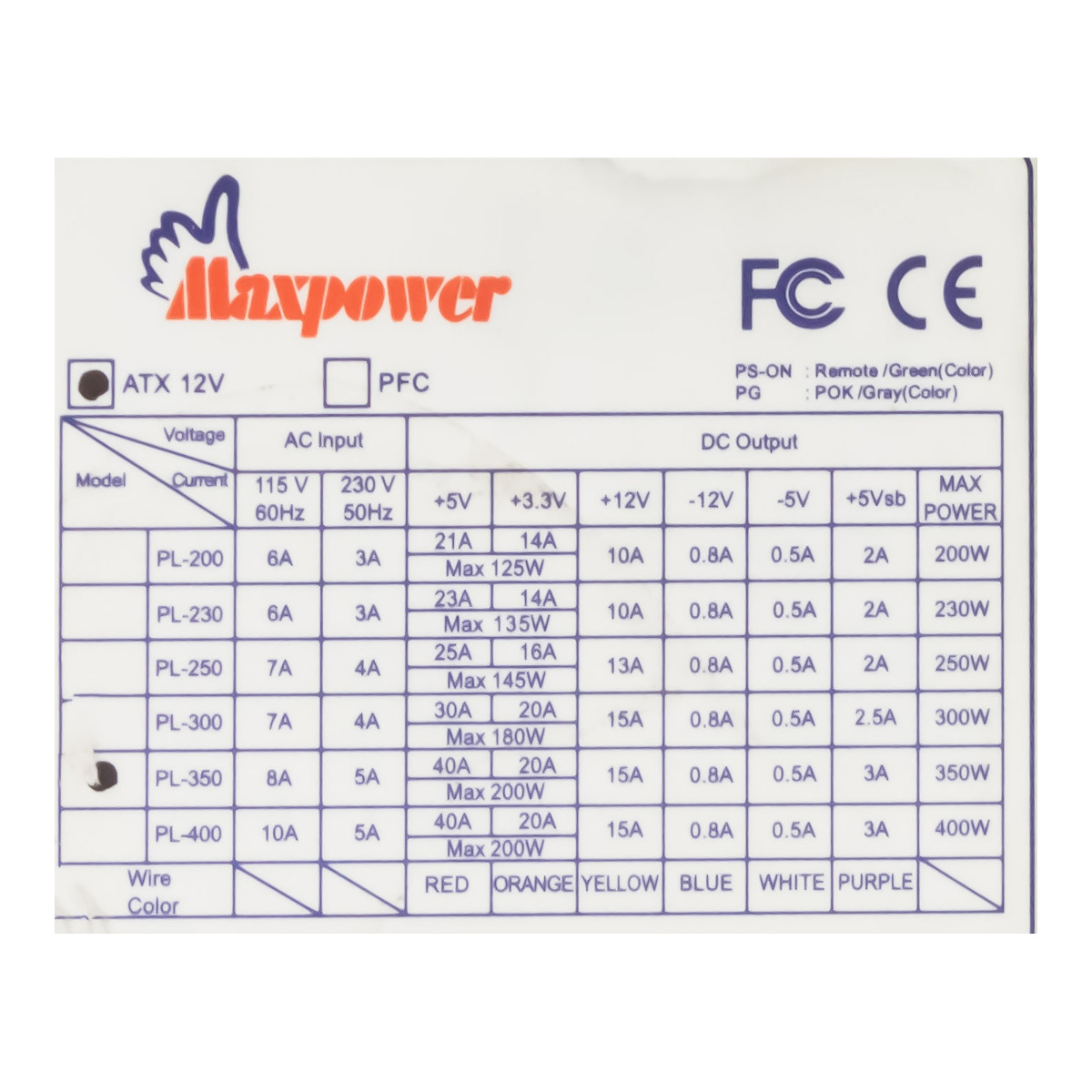 MAXPOWER PL-350 350W PSU ATX 20-PIN ATX12V AUX MOLEX FDD