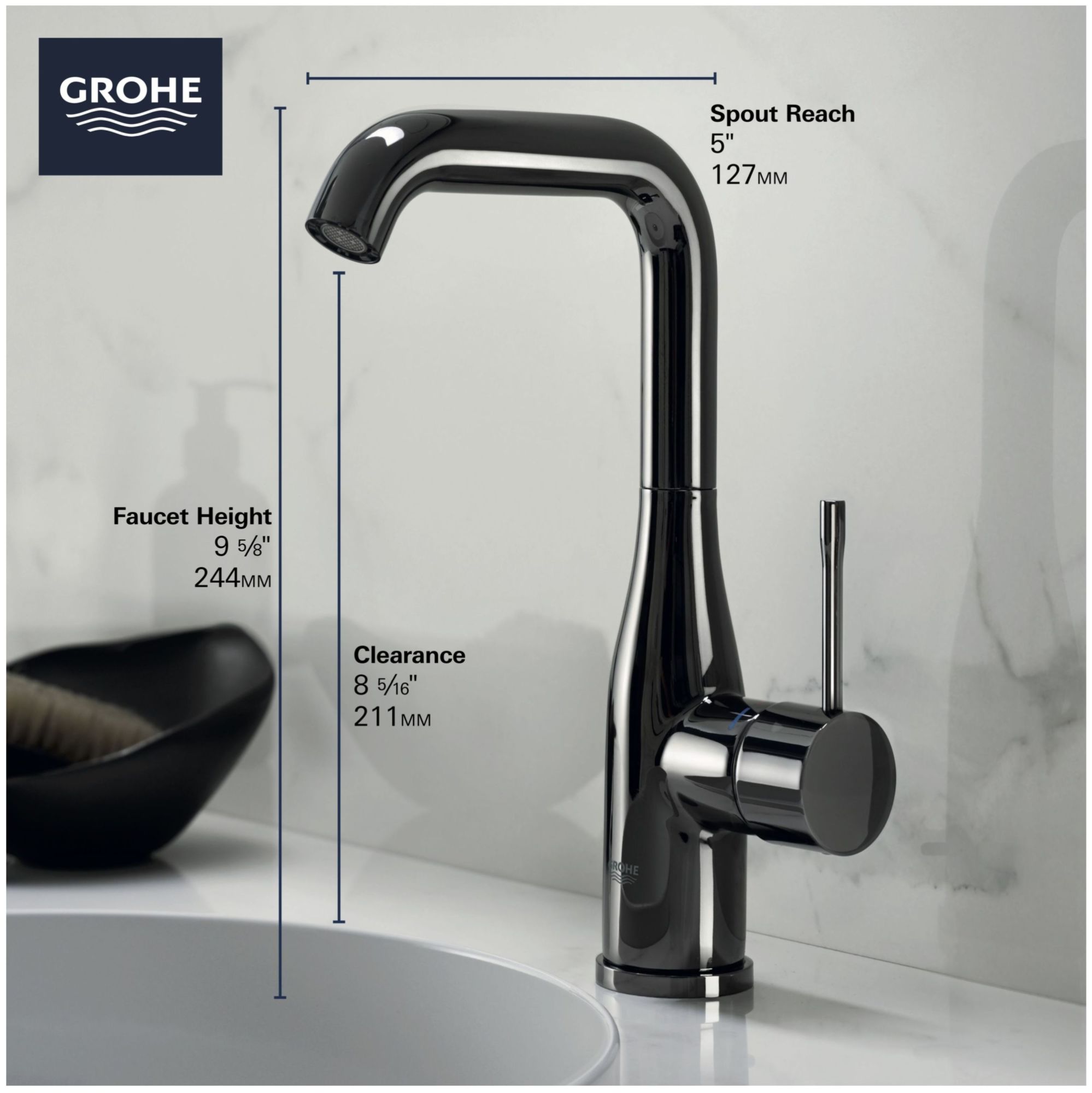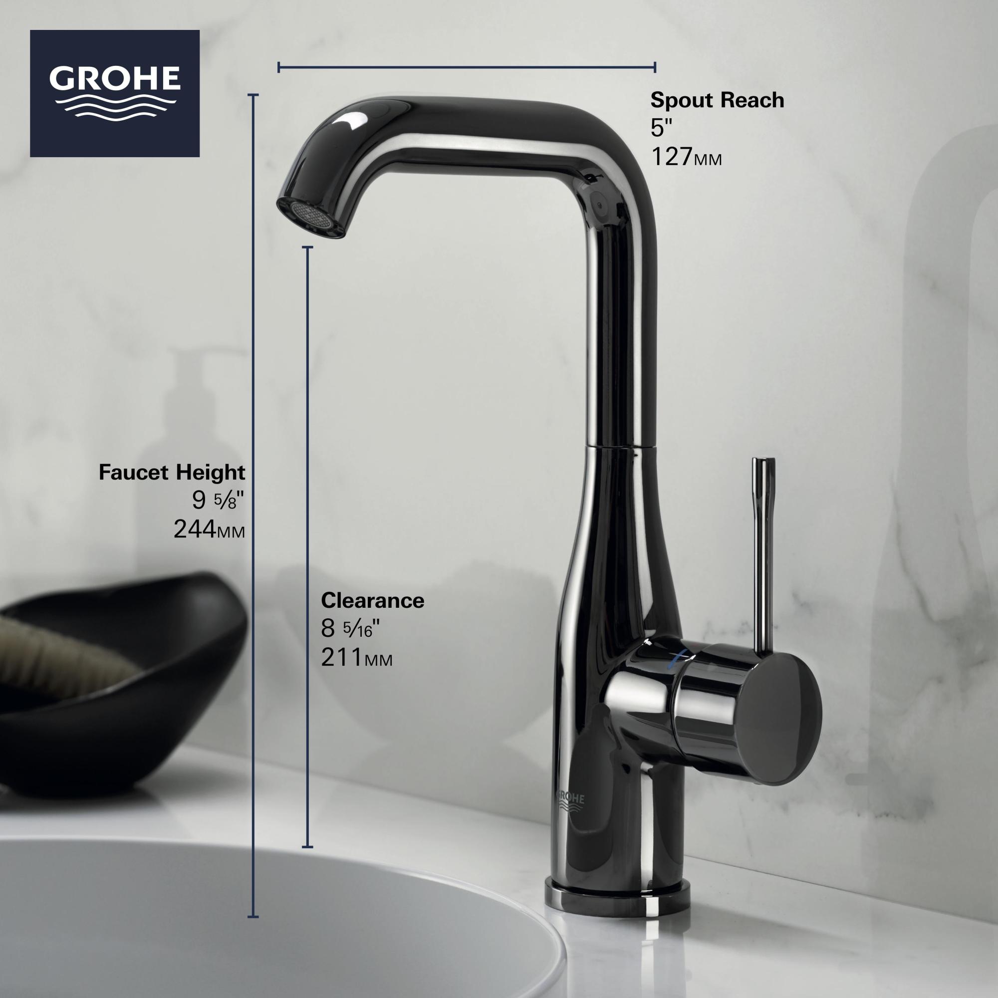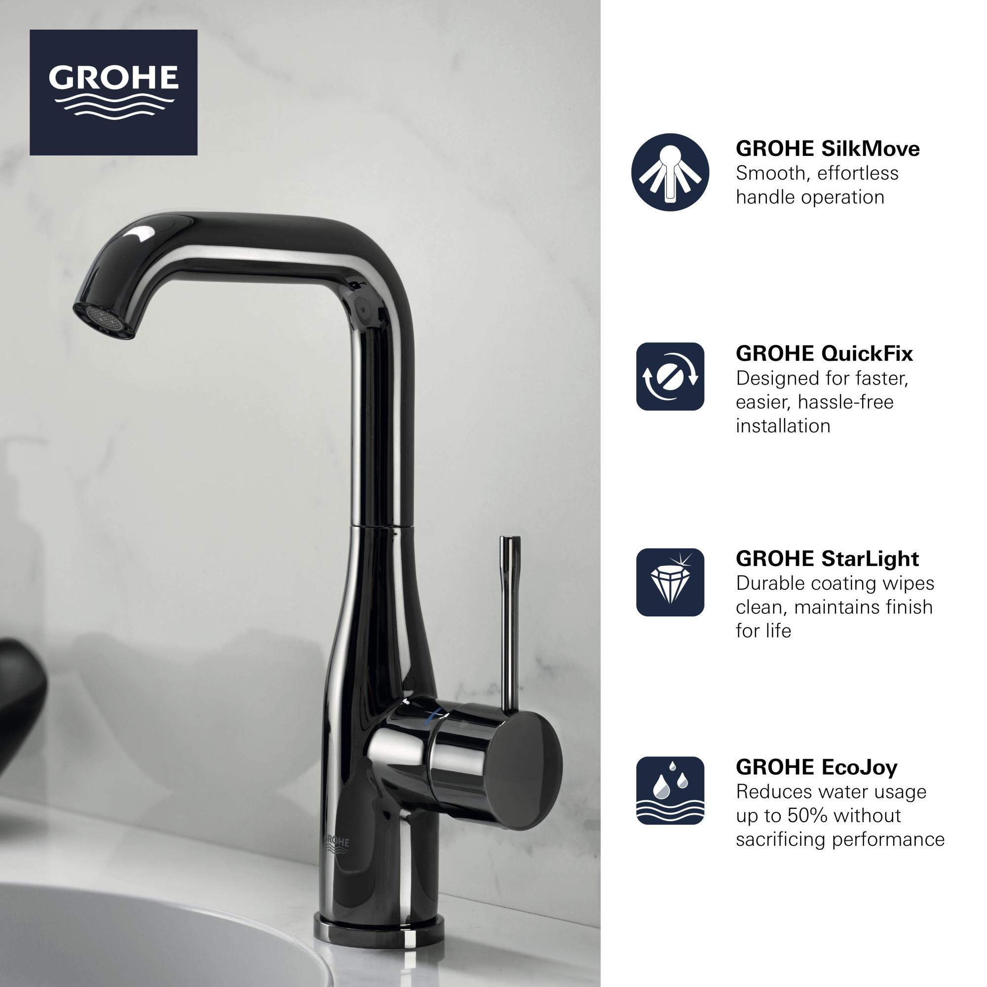 Item DescriptionSleek, sophisticated and available in an array of exquisite finishes, the Grohe Essence side-handle centerset bathroom faucet is a distinctive style with a gently curved swivel spout and impressive features engineered for today’s well-appointed home. Offering superior performance with exclusive Grohe SilkMove handle operation, and lasting beauty with the durable Grohe StarLight finish, the Essence faucet embodies all the elements of precision craftsmanship and design excellence.