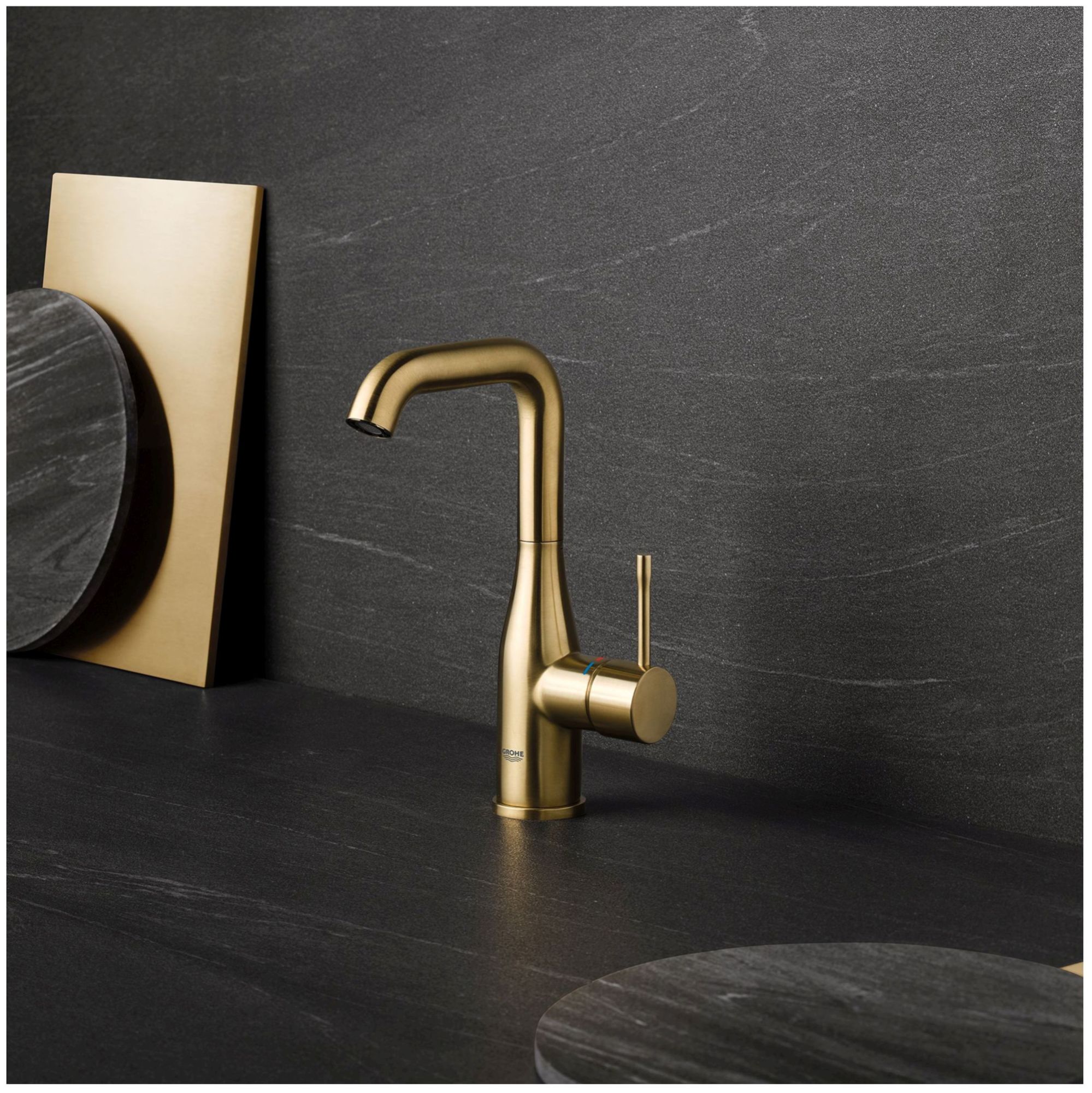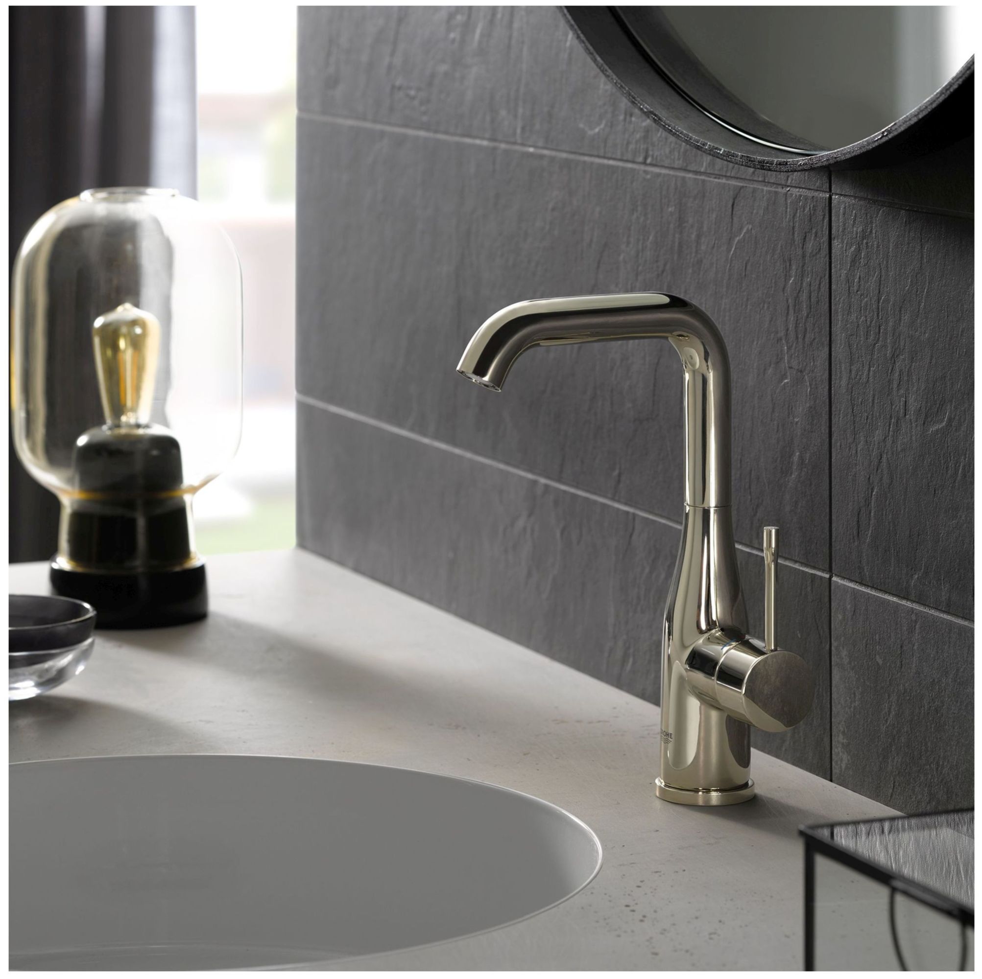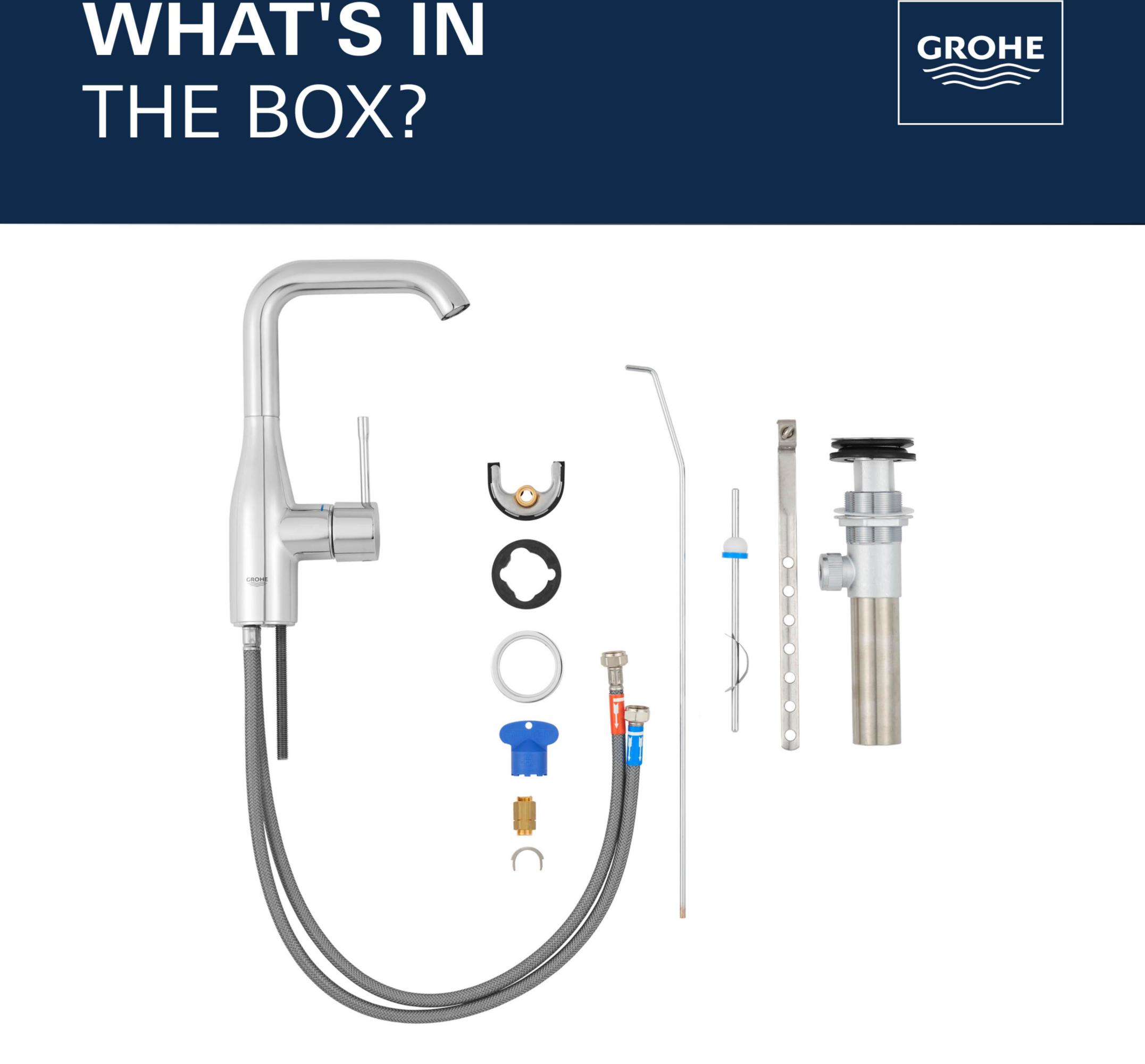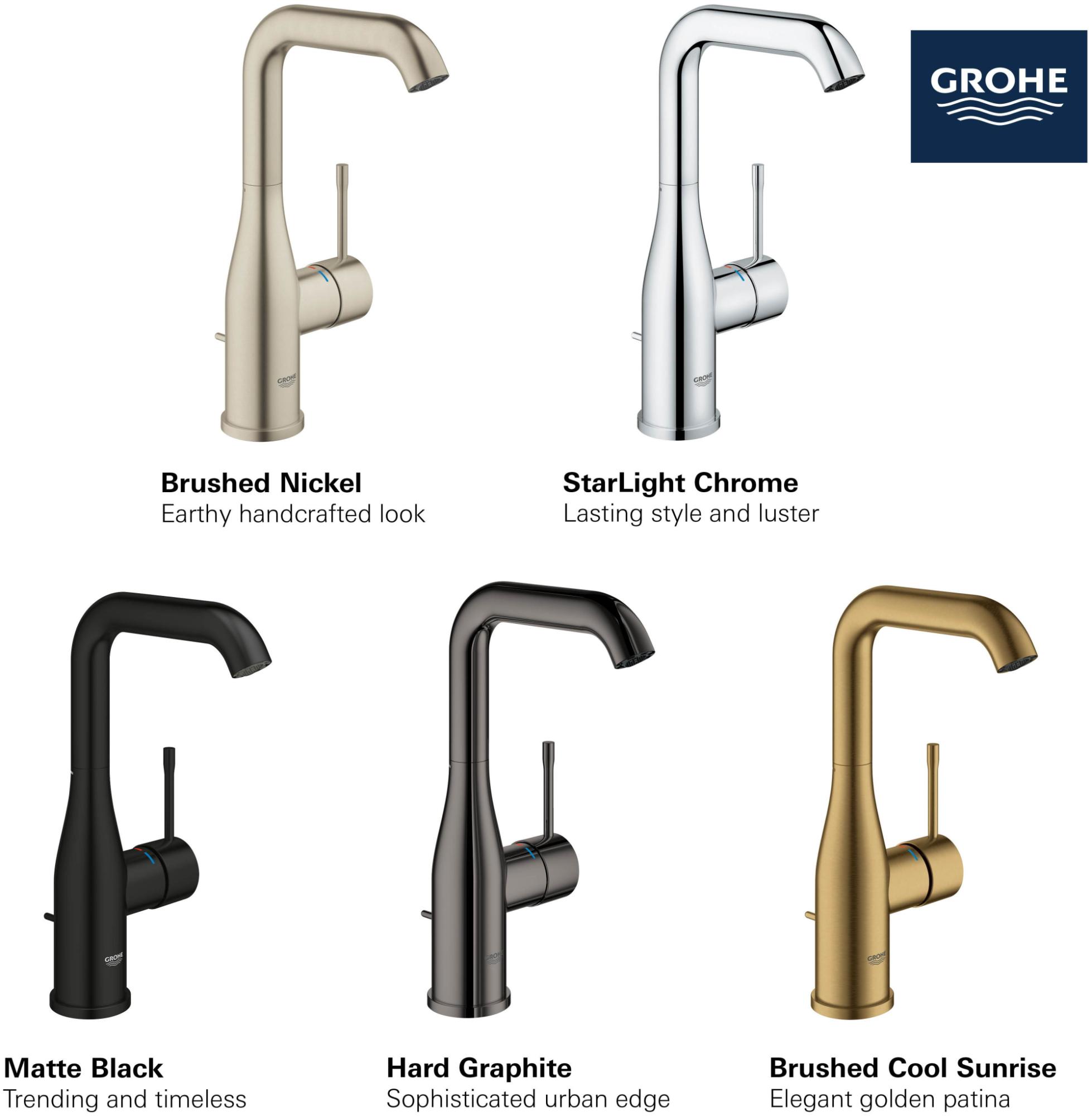 Item DescriptionSleek, sophisticated and available in an array of exquisite finishes, the Grohe Essence side-handle centerset bathroom faucet is a distinctive style with a gently curved swivel spout and impressive features engineered for today’s well-appointed home. Offering superior performance with exclusive Grohe SilkMove handle operation, and lasting beauty with the durable Grohe StarLight finish, the Essence faucet embodies all the elements of precision craftsmanship and design excellence.