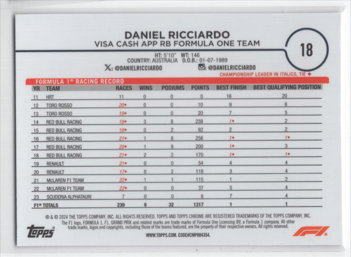 #18 2024 ) Daniel Ricciardo Visa Cash App RB Formula One