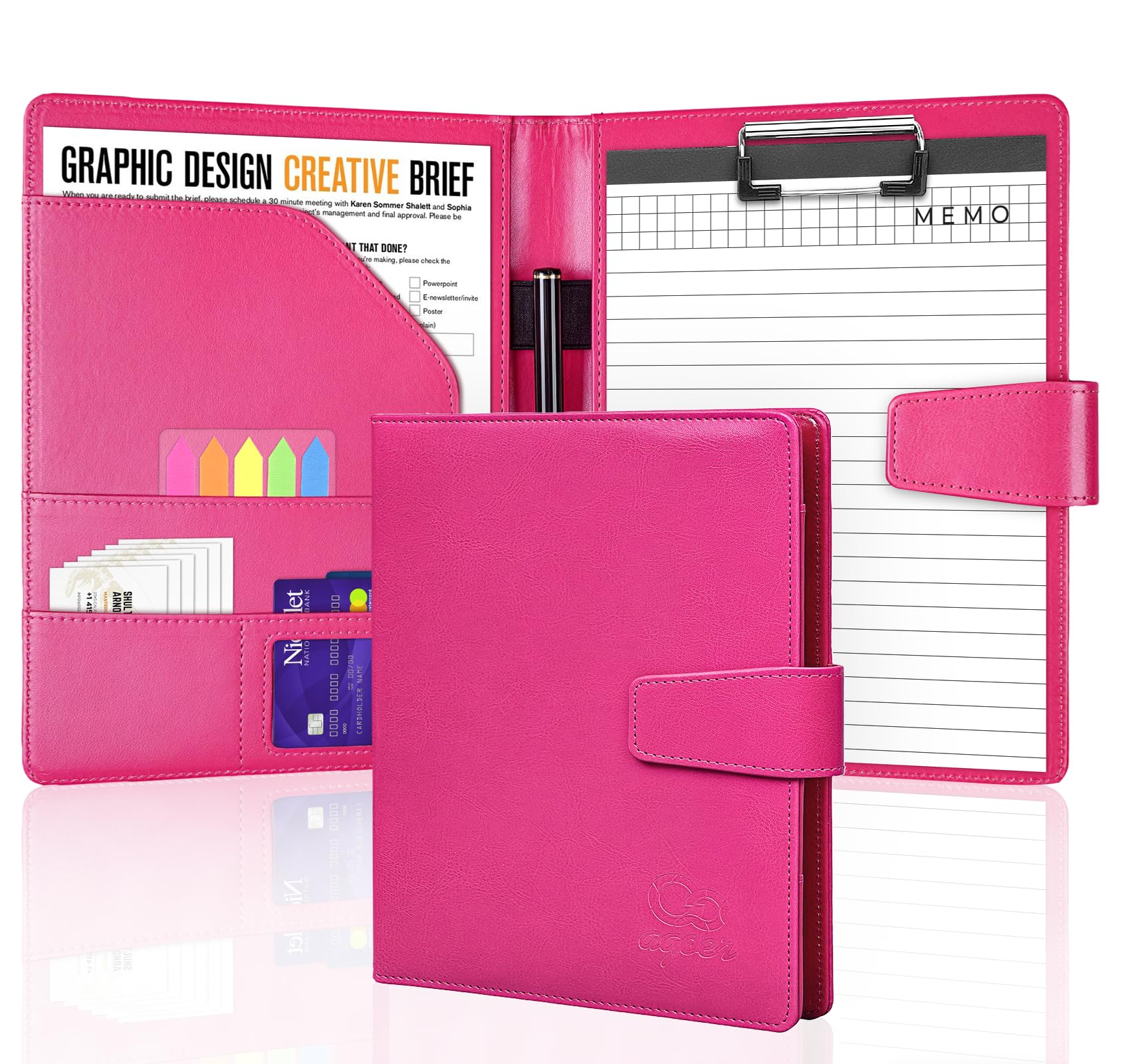 Are you looking for a padfolio that combines both style and functionality?The Agoer padfolio is a great option, serving as a real confidence booster!Specification of A5 Mini Portfolio:Color: Rose RedMaterial: PU Leather/Magnetic bucklesSize: 9.25 x 6.89 inche. Fit A5 sizeNotepad Size: 8.27x 5.79x 0.2 inchesSuitable Devices: Business Document, Legal pads, TabletsPackage Includes:A5 Leather FolderA5 NotepadSet of Arrow Sticky Notes (20 sheets in 5 colors)Black Pen