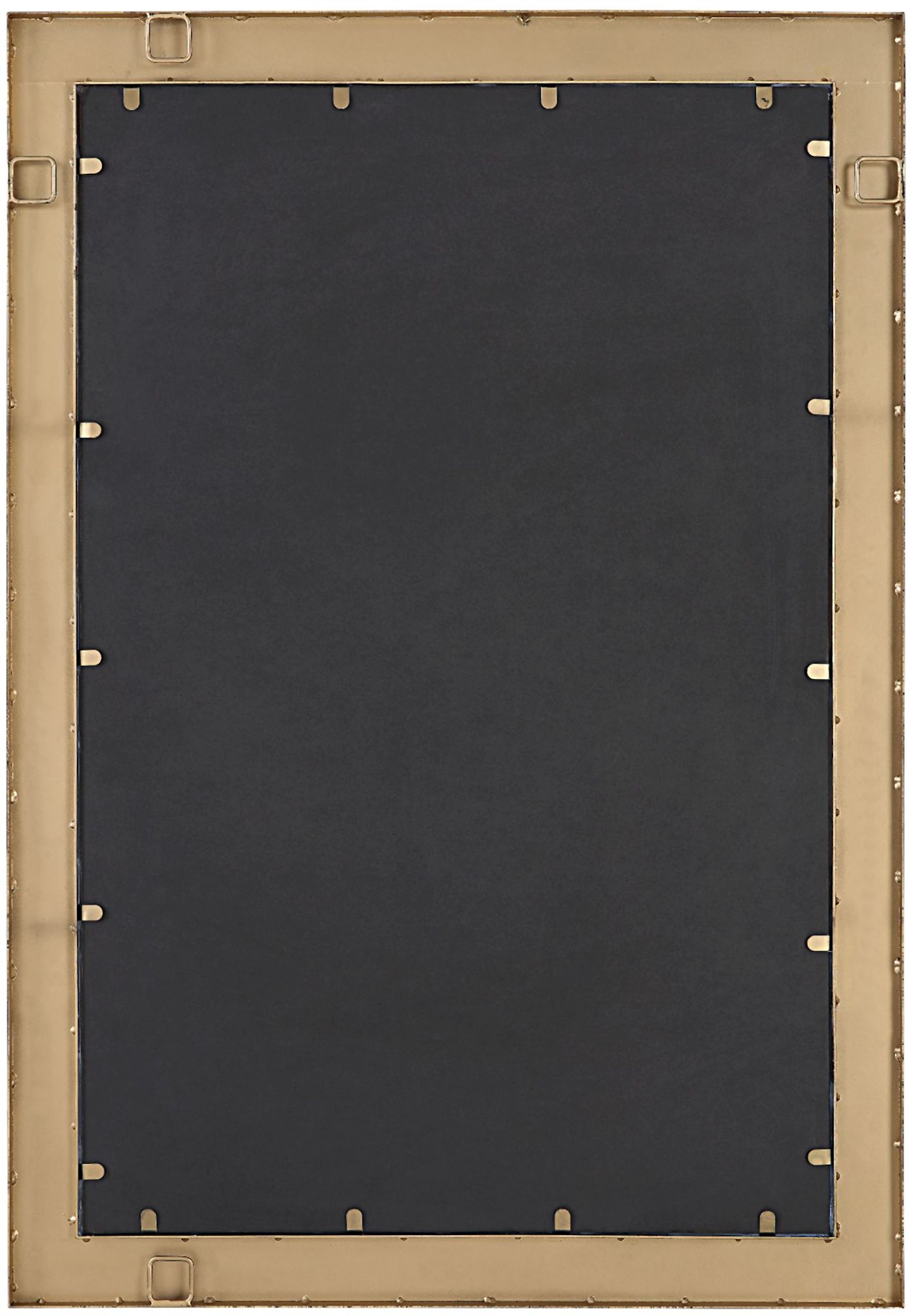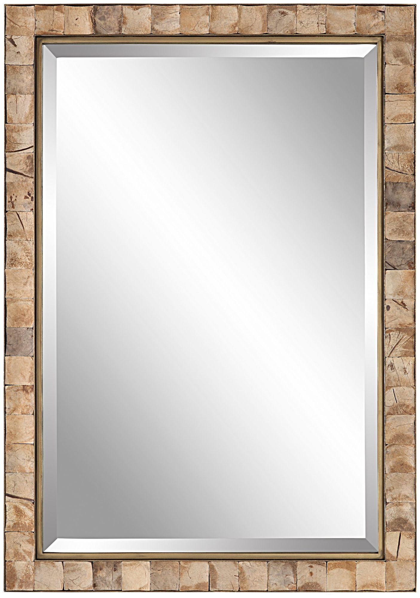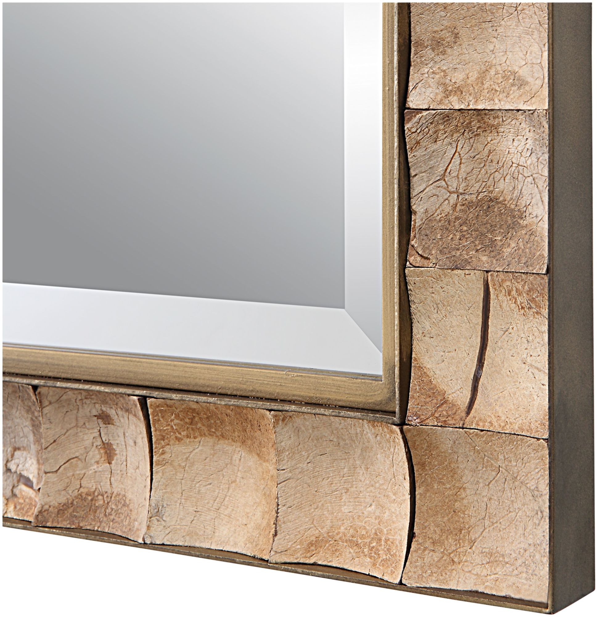 - This rectangular mirror showcases an iron strap frame finished in dark gold, accented by concaved, polished coconut shells inlays