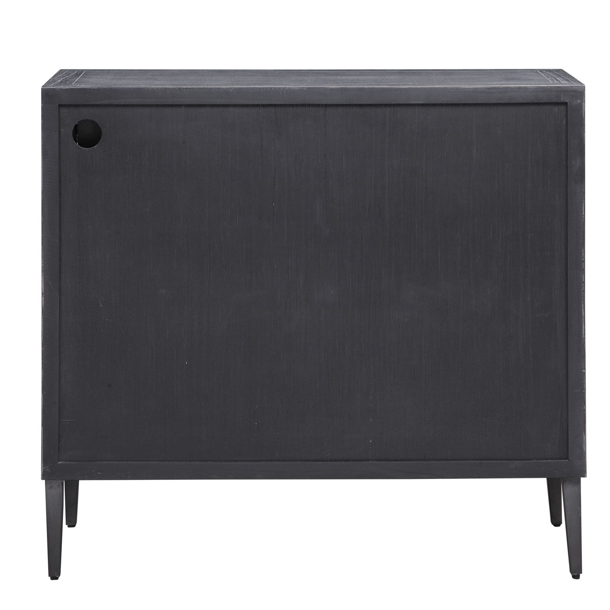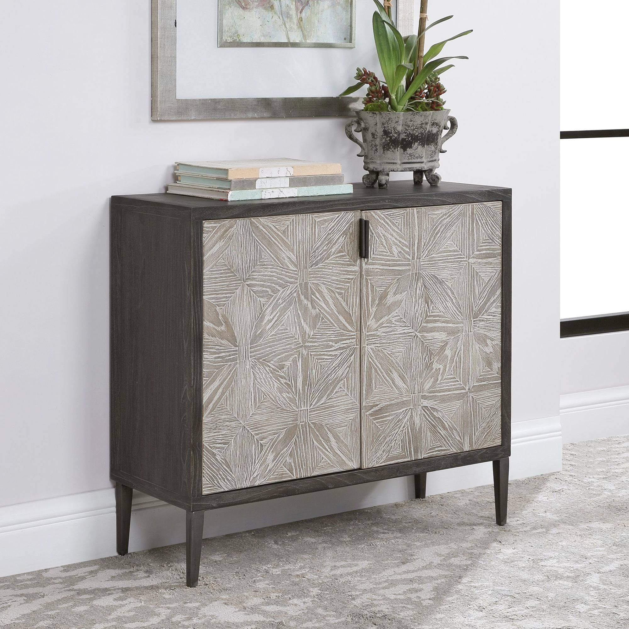 - Showcasing a modern lodge style, this two door cabinet features hand pieced mosaic doors in oak veneer finished in light gray, with a contrasting elm veneer exterior finished in deep black with light gray glazing