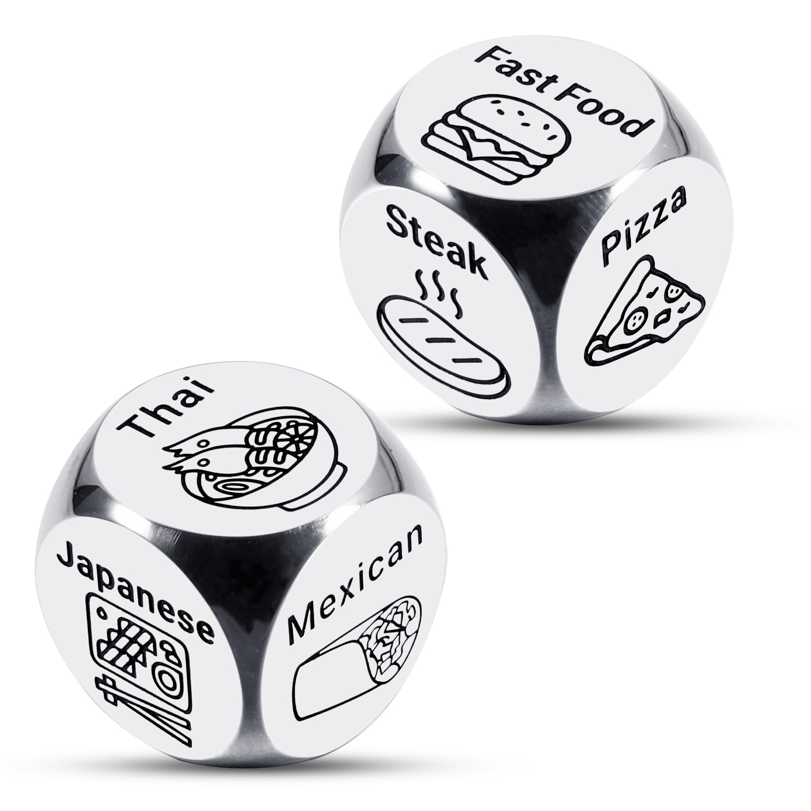 Deciding Dinner Has Never Been This Fun!Tired of asking ""What do you want to eat?"" and getting ""I don't know"" every time? These stainless steel food decision dice are here to save your mealtime! Just roll the two dice and let fate choose dinner for you. Whether you're planning a romantic evening or just want to spice up a regular night at home, this set adds laughter and simplicity to your routine.Perfect for Anniversaries, Birthdays & HolidaysFun for Couples and FamiliesMealtime arguments? Gone. These dice are an exciting way to solve the eternal food debate. Great for date night gifts, gifts for boyfriend, gifts for girlfriend, wedding gifts for couple, bridal shower gifts, or even housewarming gifts for new couples. They’re also ideal for engagement gifts or sweetest day gifts for her him.Stylish, Durable & Easy to UseCrafted from high-quality stainless steel, these dice are engraved with six meal options, making them a sturdy and elegant addition to any kitchen. They’re great for quick choices, spontaneous fun, and breaking the routine. The engraving is deep, clear, and permanent—easy to read and stylish enough for display.Gift-Ready PackagingThe set includes two solid dice in a premium gift box—perfect for giving. Whether you’re shopping for valentines day gifts for girlfriend, Christmas stocking stuffers, or funny gifts for adults, these dice make a delightful surprise. Make someone’s life easier and more amusing—give the gift of decision today!