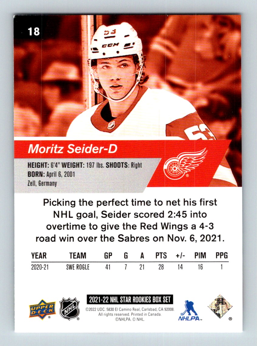 #18 Moritz Seider 2021-22 Upper Deck Star Rookie \ RC Red Wings
