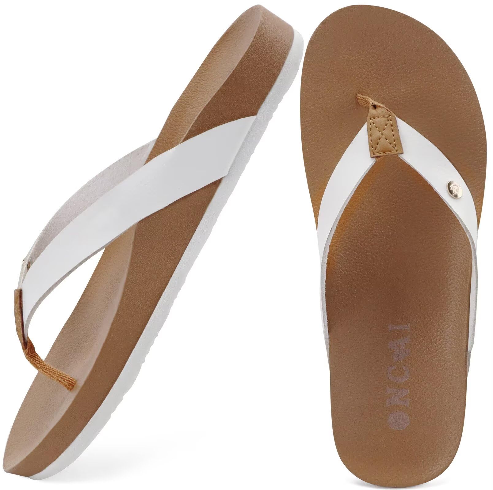 ONCAI Womens Flip Flops For Women Comfortable Strap Yoga Mat Non-Slip Women's Thong Sandal Casual Summer Beach Slippers With Arch Support White/Khaki Size 8.5