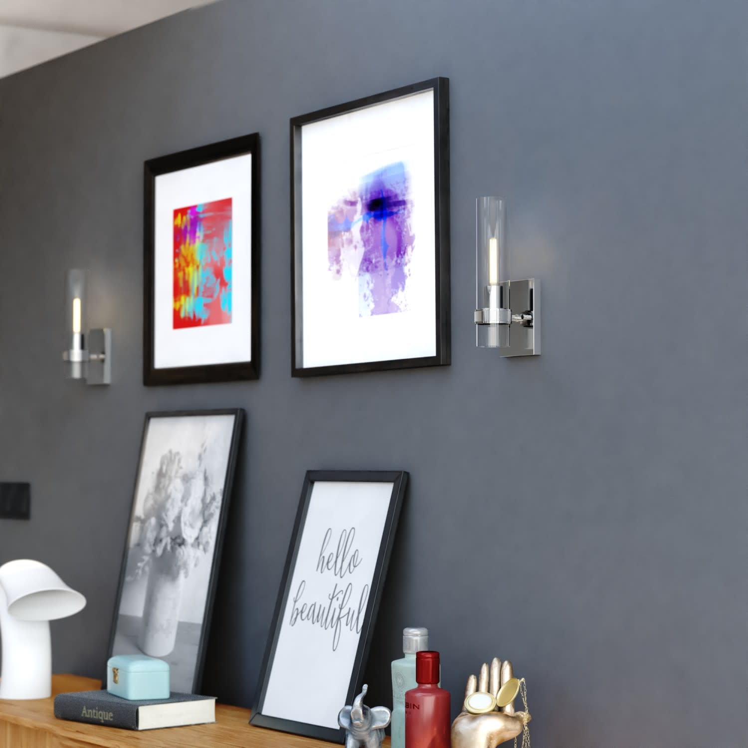 Item DescriptionThe Bari collection is a blend of simplicity and sophistication featuring a knurled ring. Ample light emanates from the elongated shade creating a dramatic effect. Pair with a clear filament bulb for the optimal look. This damp rated wall sconce is ideal for bathrooms, hallways, stairways, and bedrooms.