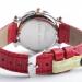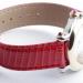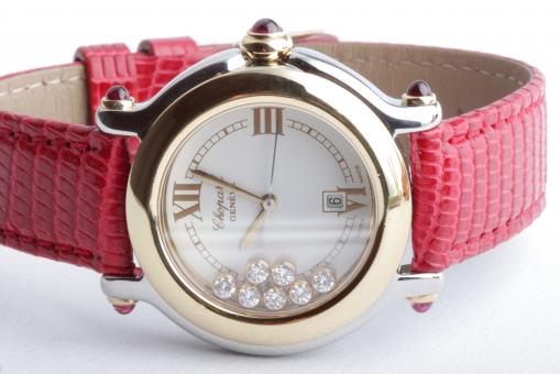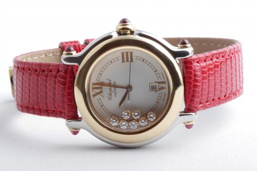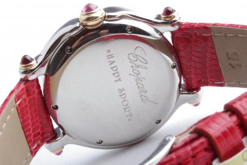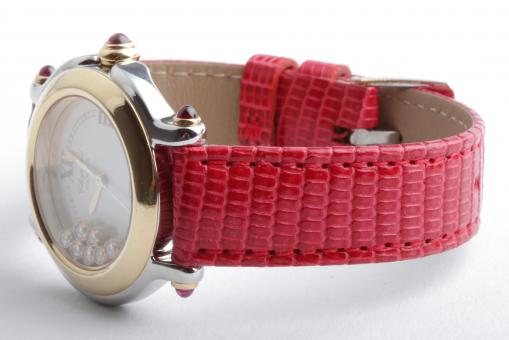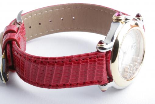 Zu sehen ist die hochfeine Damenuhr Happy Sport aus dem noblen Hause Chopard. Charakteristisch für dieses Modell sind die beweglichen Diamanten auf dem Zifferblatt, die ein glitzerndes Schauspiel der besonderen Art liefern und Damenherzen begeistern. Die Uhr stammt aus den frühen 2000er Jahren und befindet sich, wie auf den Bildern zu erkennen, in gepflegtem Zustand. Die Schließe ist original von Chopard, das rote Eidechsenarmband ist neutral und neu, es passt hervorragend zu den 5 Rubinen im Cabochon-Schliff auf dem Gehäuse.