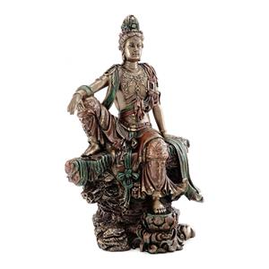 This beautiful statue of the Buddhist goddess Kwan Yin is made from cold cast resin that is bronze plated. It is a high quality statue made with superior craftsmanship and has excellent details.