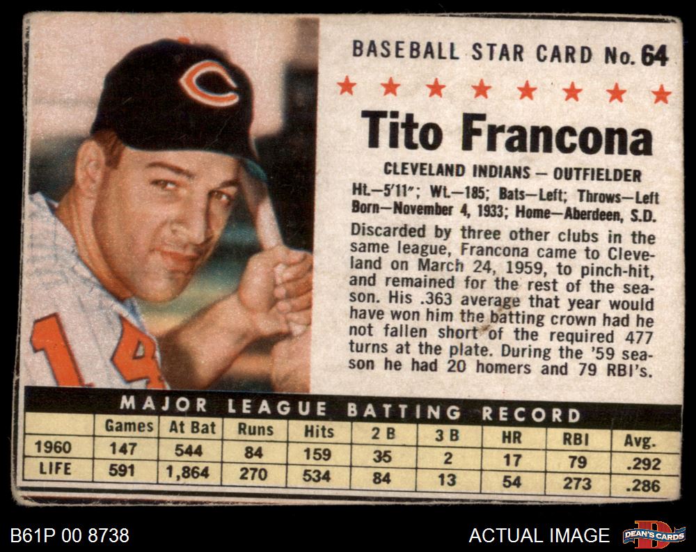 This 1961 Post Cereal Cleveland Indians Near Team Set contains the majority of the Indians cards and makes a great gift for any Cleveland Indians fan. ?With an inventory of over 20,000 team sets, Dean's Cards has Team Sets & Near Team Sets in multiple conditions.