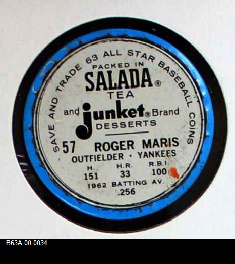 | 1963 Salada Metal Coins #57 Roger Maris | 5 - EX | Front | Back |