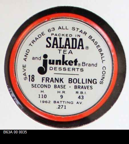 | 1963 Salada Metal Coins #18 Frank Bolling | 6 - EX/MT | Front | Back |