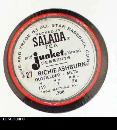 | 1963 Salada Metal Coins #27 Richie Ashburn | 6 - EX/MT | Front | Back |