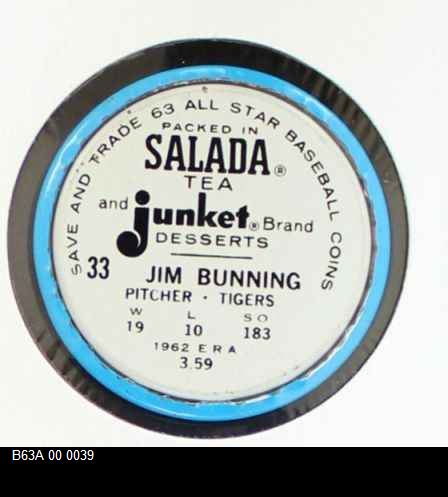 | 1963 Salada Metal Coins #33 Jim Bunning | 6 - EX/MT | Front | Back |