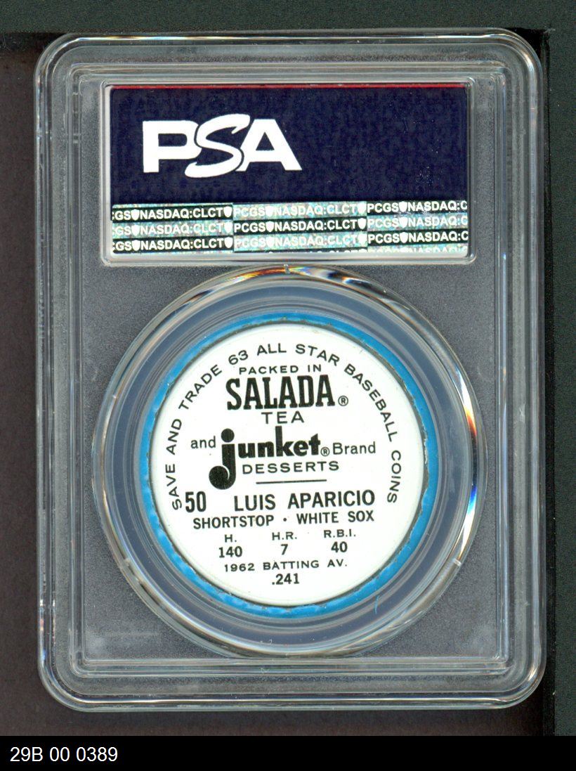 | 1963 Salada Metal Coins #50 Luis Aparicio | PSA 8 - NM/MT | Front | Back |