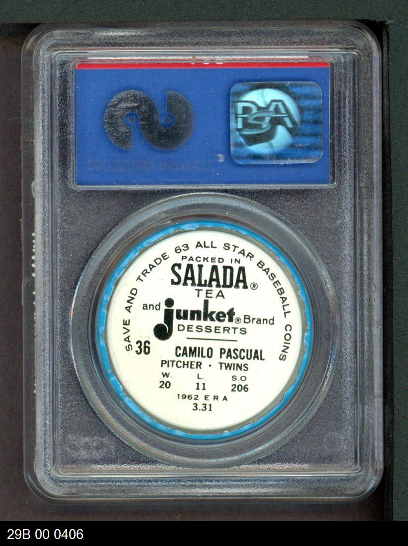 | 1963 Salada Metal Coins #36 Camilo Pascual | PSA 6 - EX/MT | Front | Back |