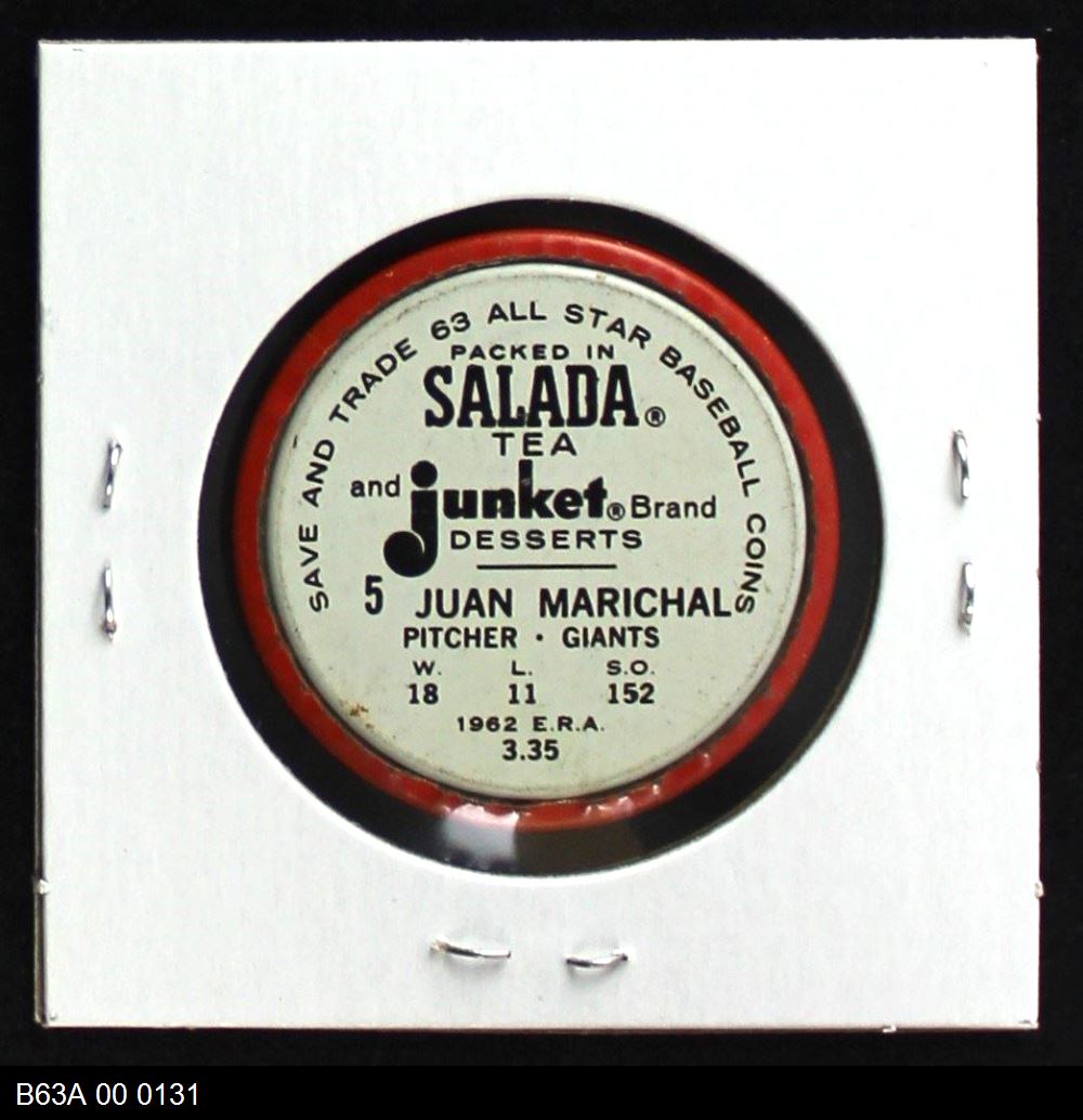 | 1963 Salada Metal Coins #5 BTN Juan Marichal | 6 - EX/MT | Front | Back |