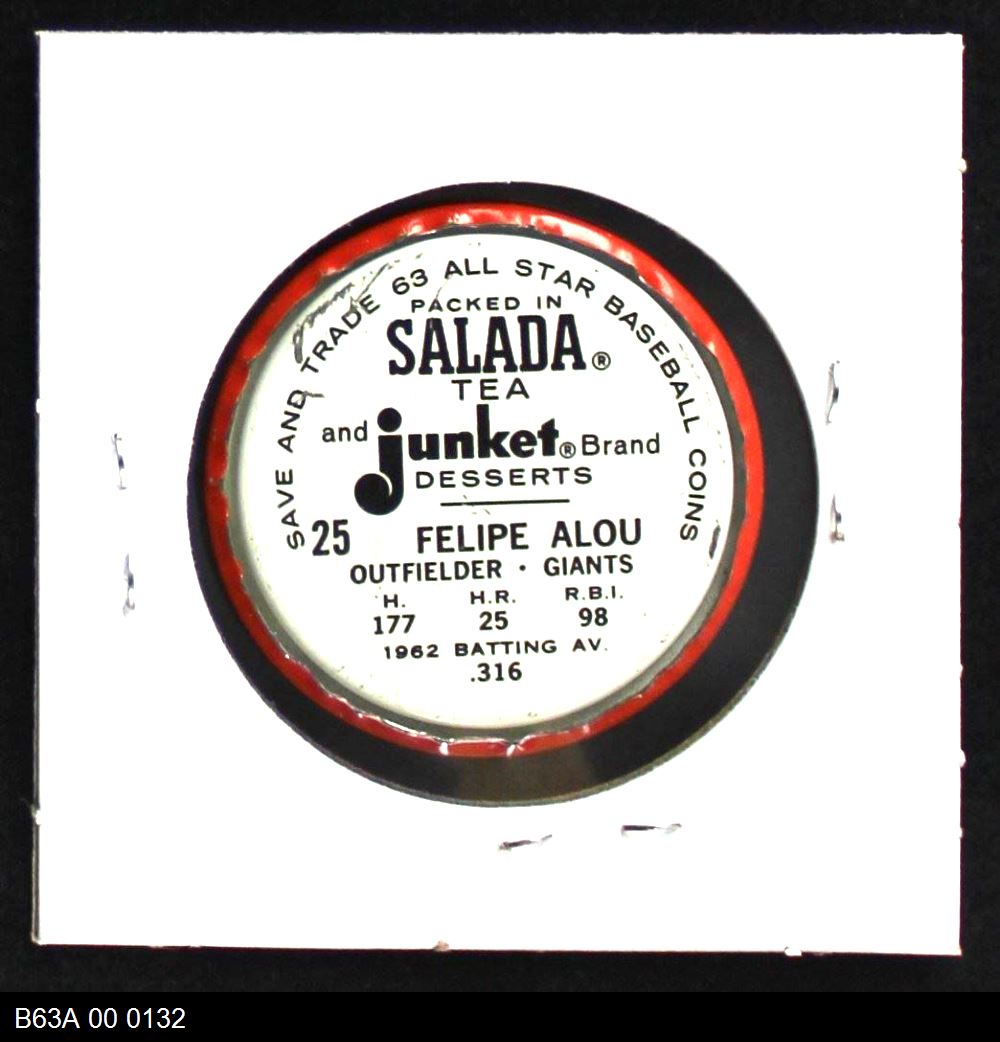 | 1963 Salada Metal Coins #25 Felipe Alou | 6 - EX/MT | Front | Back |