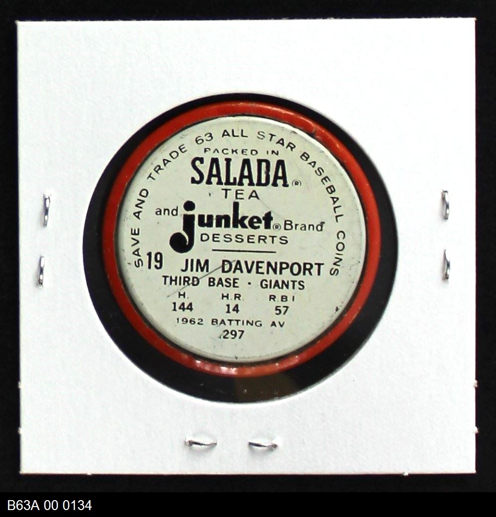 | 1963 Salada Metal Coins #19 Jim Davenport | 6 - EX/MT | Front | Back |