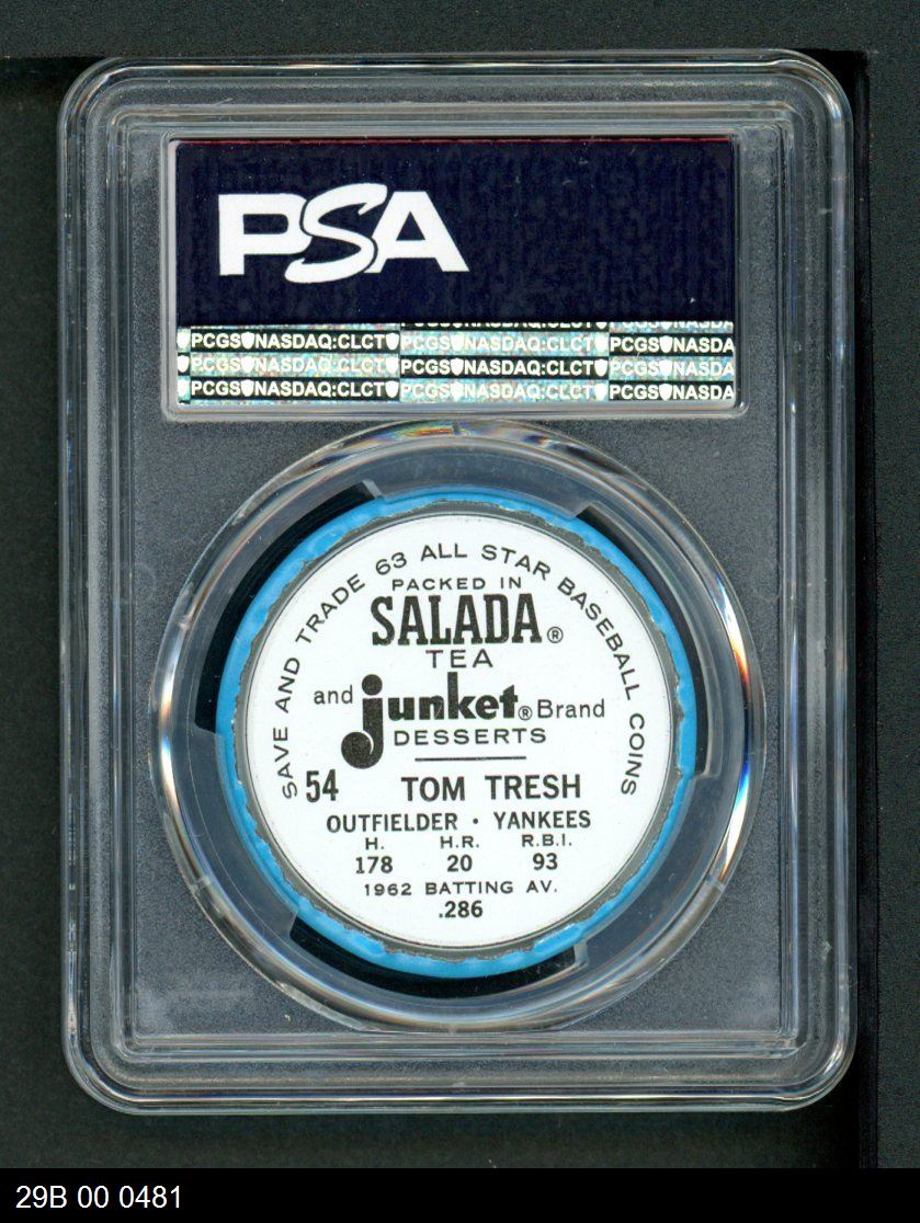 | 1963 Salada Metal Coins #54 Tom Tresh | PSA 7 - NM | Front | Back |