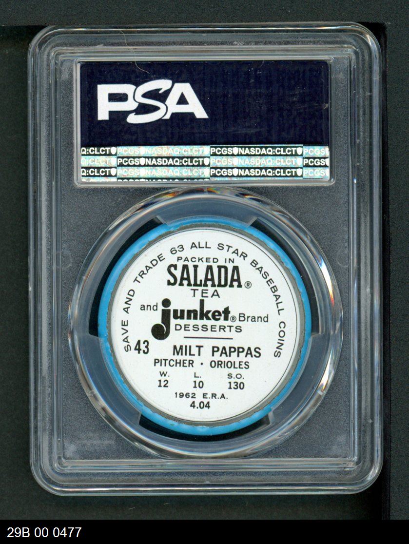 | 1963 Salada Metal Coins #43 Milt Pappas | PSA 5 - EX | Front | Back |