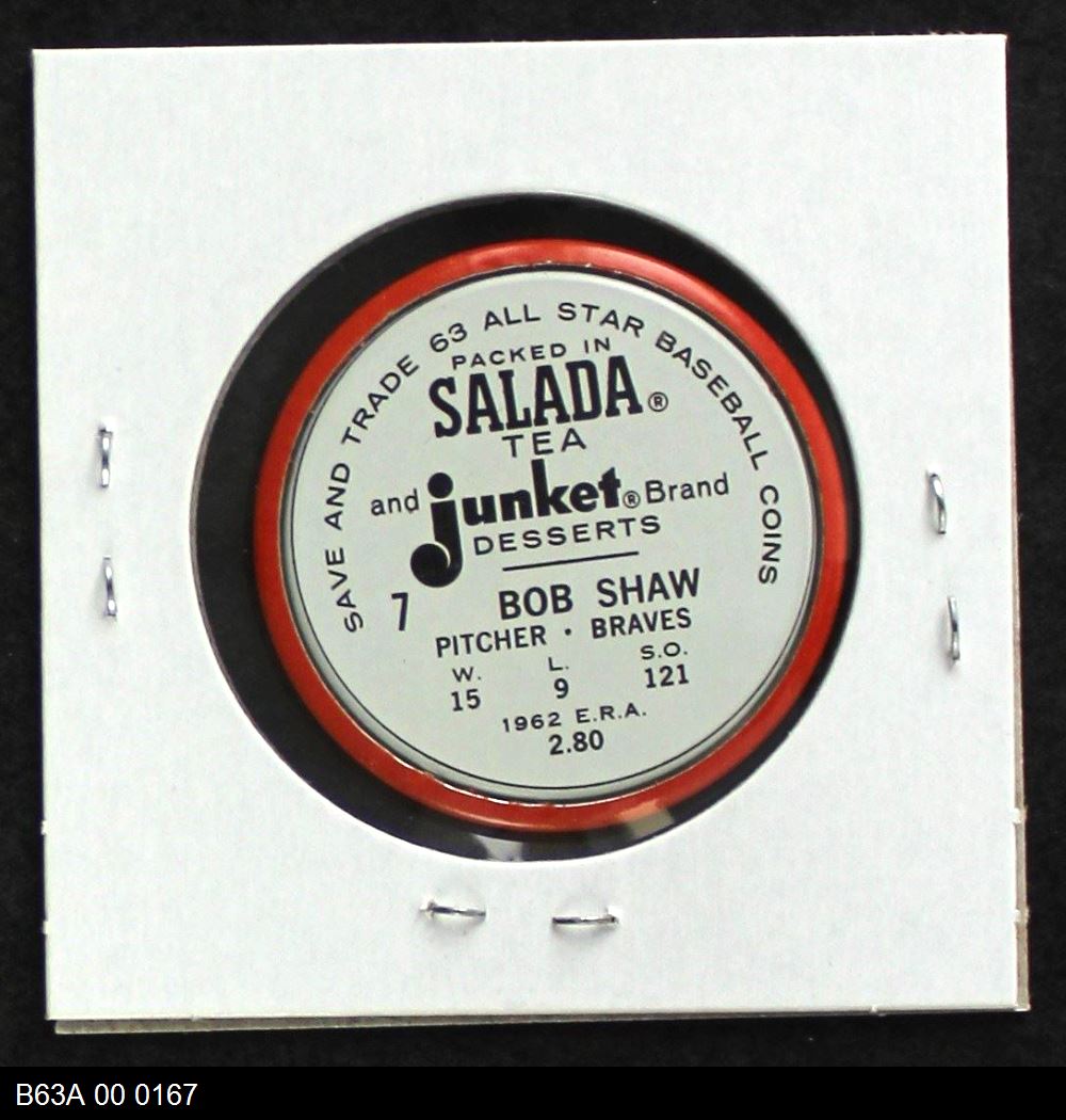 | 1963 Salada Metal Coins #7 Bob Shaw | 7 - NM | Front | Back |