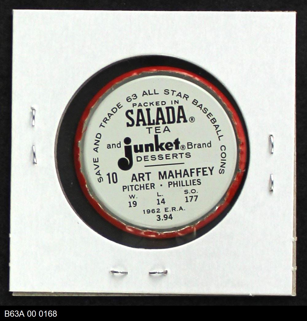 | 1963 Salada Metal Coins #10 Art Mahaffey | 7 - NM | Front | Back |