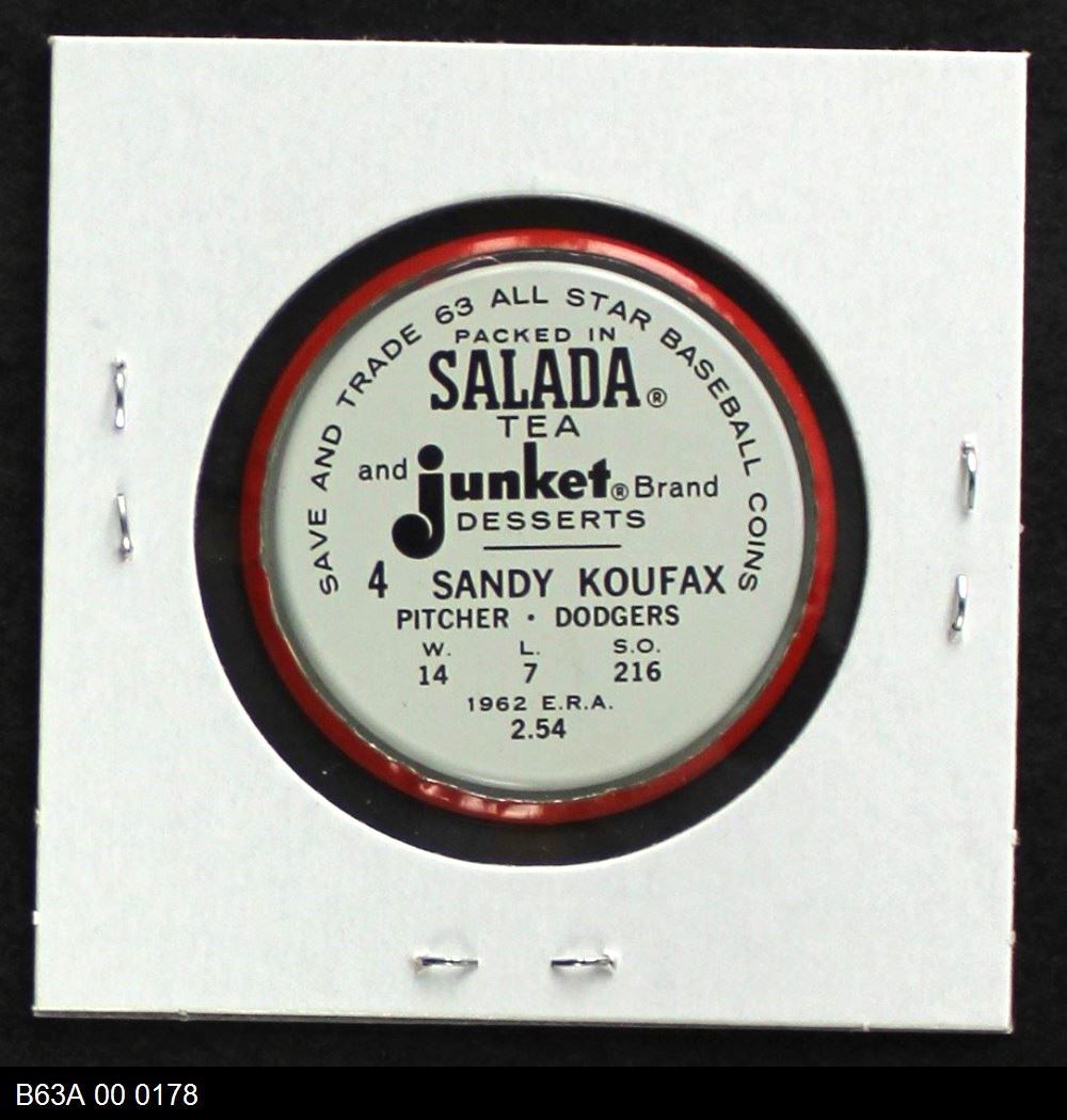 | 1963 Salada Metal Coins #4 Sandy Koufax | 7 - NM | Front | Back |